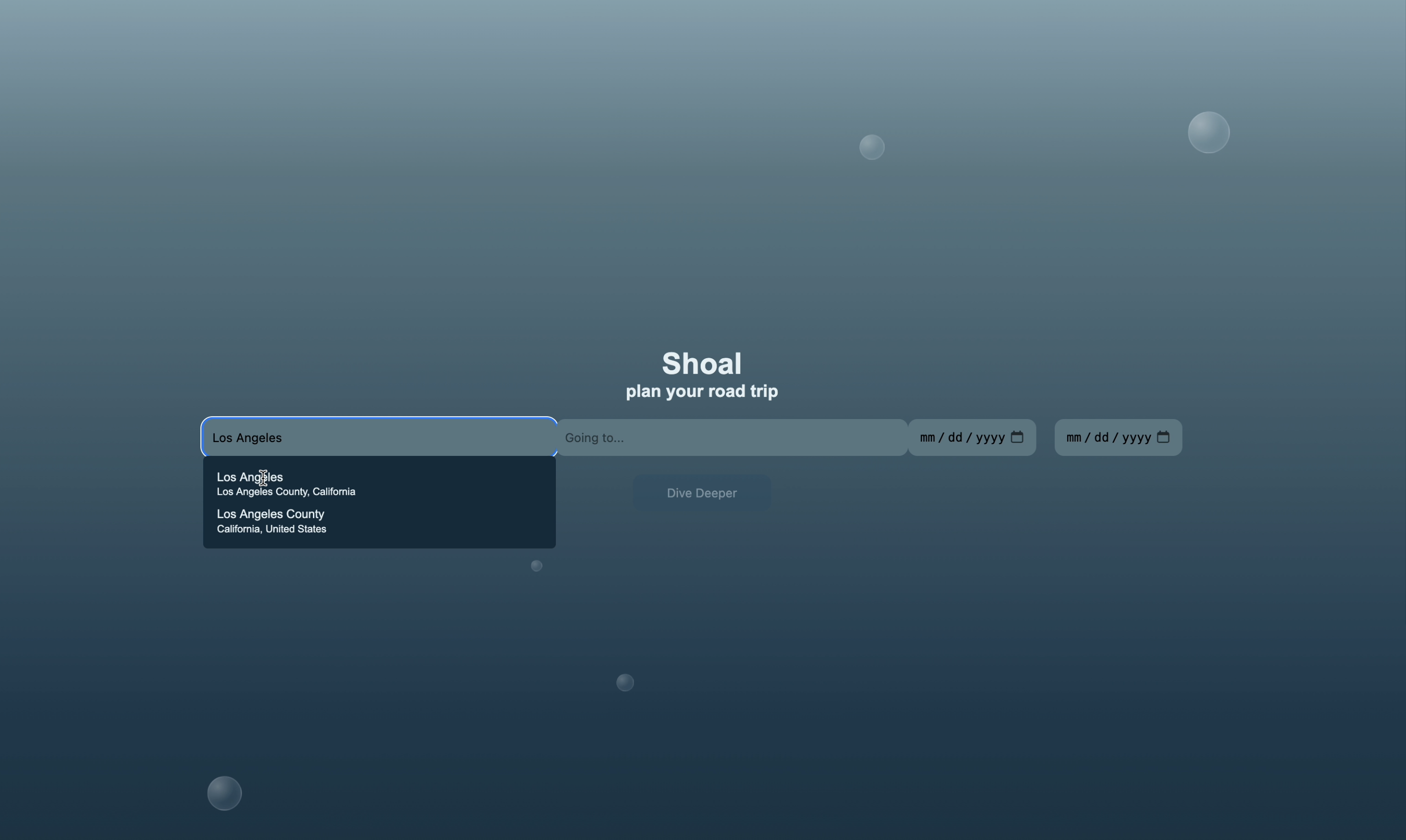 Shoal is an interactive trip planner. You search for places in plain language ("coffee fullerton"), save them as stops organized by day, and Shoal drops them as markers on a live map. Shoal computes the fastest driving path between every stop, drawing the line right on the map. Stops can be reordered or moved between days.