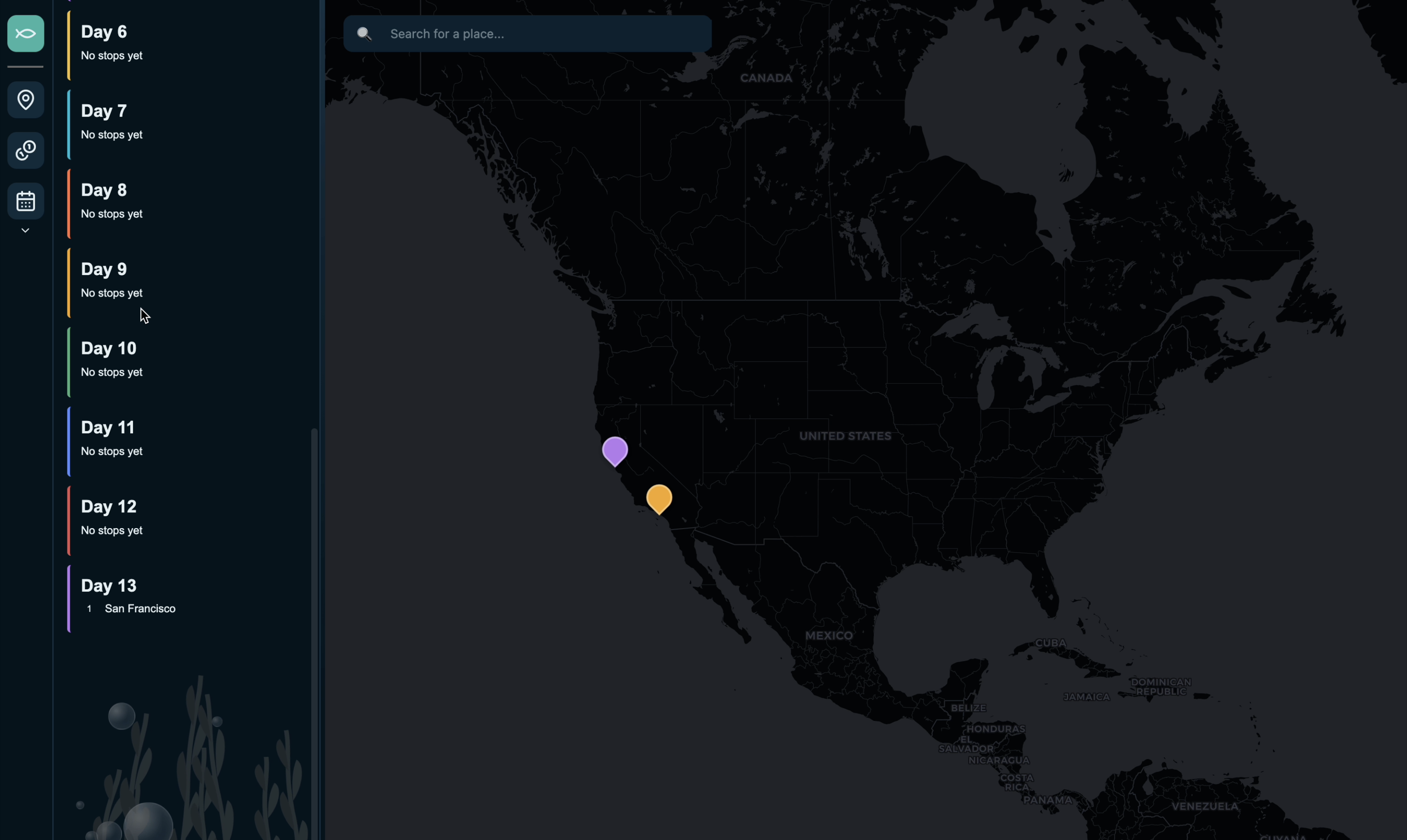 Trip planning means juggling multiple browser tabs, Maps, Notes, blogs, spreadsheets. You're hoping it all comes together, but it rarely does. We wanted a planner that treats a trip the way people actually think about it: a sequence of stops, grouped by day, on a map you can see all at once. And we wanted to build it on open data, with no API keys, no tracking, and no lock-in.