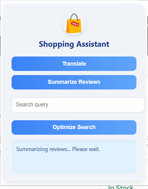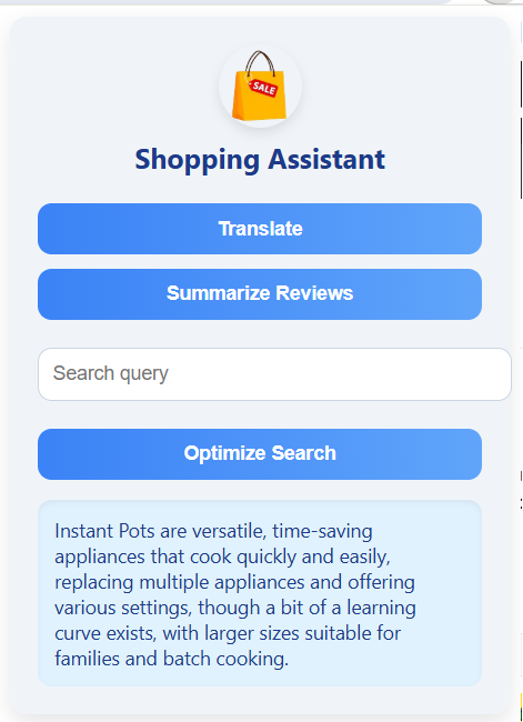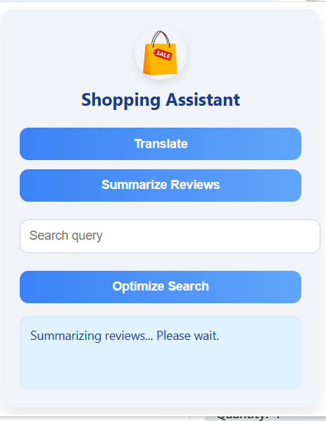 Shopping Assistant (AI) provides three main features: Translate: Converts product descriptions and reviews into your preferred language. Summarize Reviews: Distills long, detailed reviews into concise insights, highlighting pros and cons. Optimize Search Queries: Suggests alternative phrasing to improve search results. All features currently use mocked AI functions for submission, but they are ready to be swapped with real Chrome AI APIs (Translator, Summarizer, Rewriter) once models finish downloading.