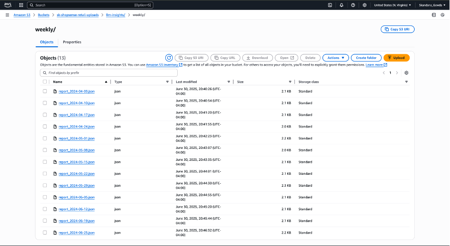 - Automated Report Delivery: The AI-generated insights are used to create a professional PDF report, which is saved to another S3 bucket. Finally, Amazon EventBridge runs on a schedule (e.g., every 10 minutes in my use case or weekly or monthly), finds all newly generated reports, compiles their links into a single email, and sends a comprehensive summary to the user.