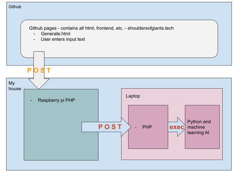 After the models are created, they are sent to our Raspberry Pi server to be hosted on our website Shoulders of Giants. This site uses PHP coupled with Python Scripts, allowing users to interact with the models stored on the Raspberry Pi. We also used Bootstrap to make the UI/UX as intuitive as possible.