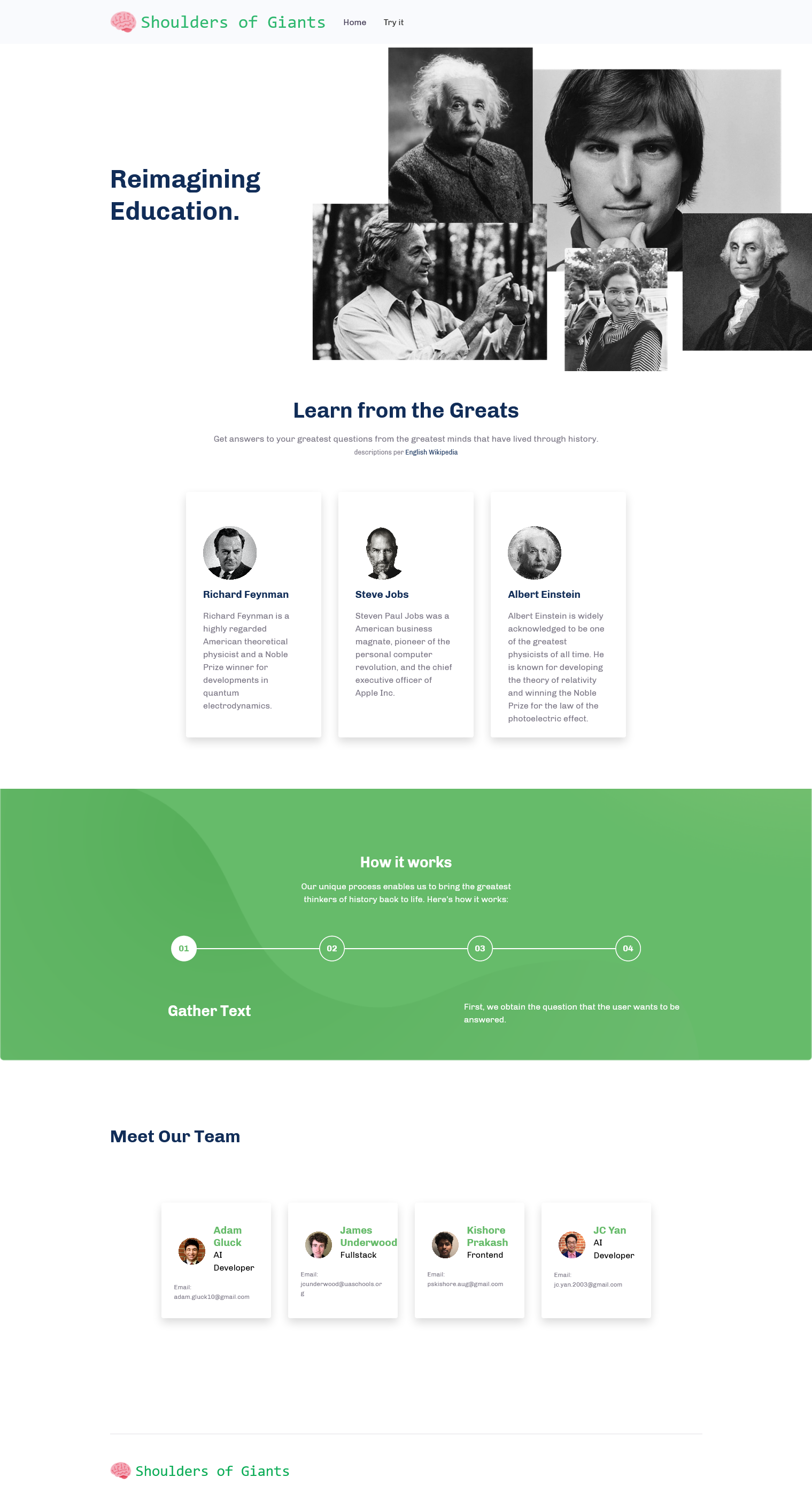 To help satisfy this curiosity, we created Shoulders of Giants, an AI-powered website that allows students to interact with historical figures.