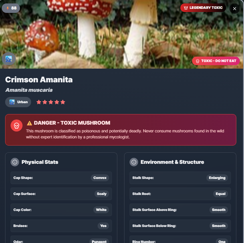 Our inspiration came from a shared love for the outdoors and a fascination with the hidden world of fungi. We realized that while foraging for mushrooms is a deeply rewarding experience that connects you with nature, it's gated by a steep learning curve and a legitimate fear of misidentification. We'd find beautiful, strange mushrooms on hikes and ask ourselves, "What is this? Is it edible? Is it rare?" The process of digging through dense books or posting blurry photos to online forums felt archaic. We were inspired by the simple, powerful interface of apps like Pokemon Go and thought, "What if we could create a 'Pokedex for Fungi?'" A tool that uses the magic of AI to make the world of mycology accessible, safe, and incredibly fun for everyone, from the curious hiker to the dedicated forager.