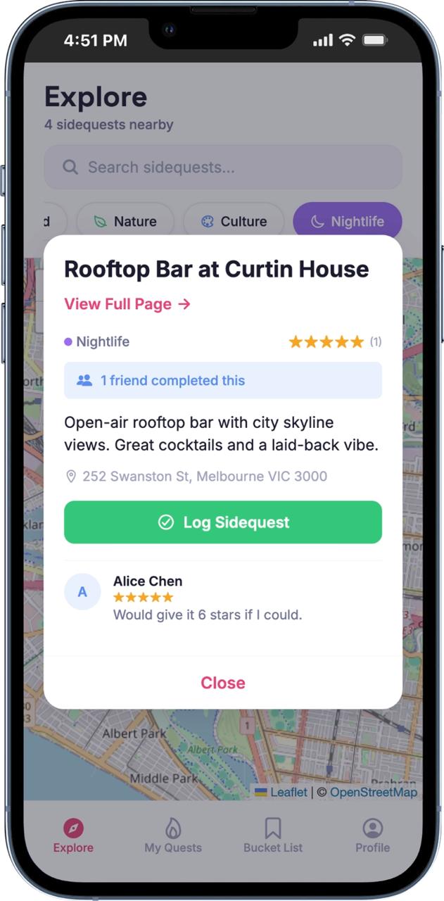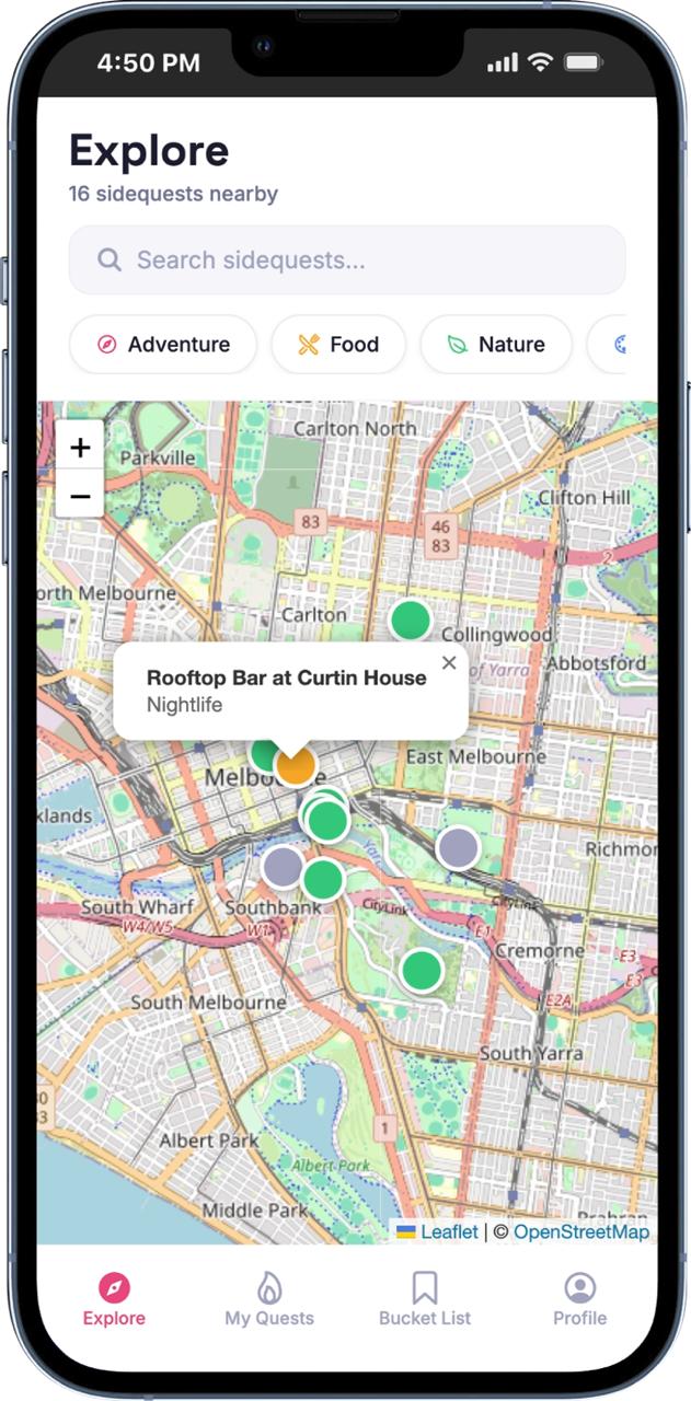 Sidequests is a social experience-tracking app. Open it up and you see a map centered on your location, dotted with pins representing nearby experiences — we call them sidequests. A hidden waterfall, the best brunch spot in town, a cliff you can abseil down, a night market with killer street food.
