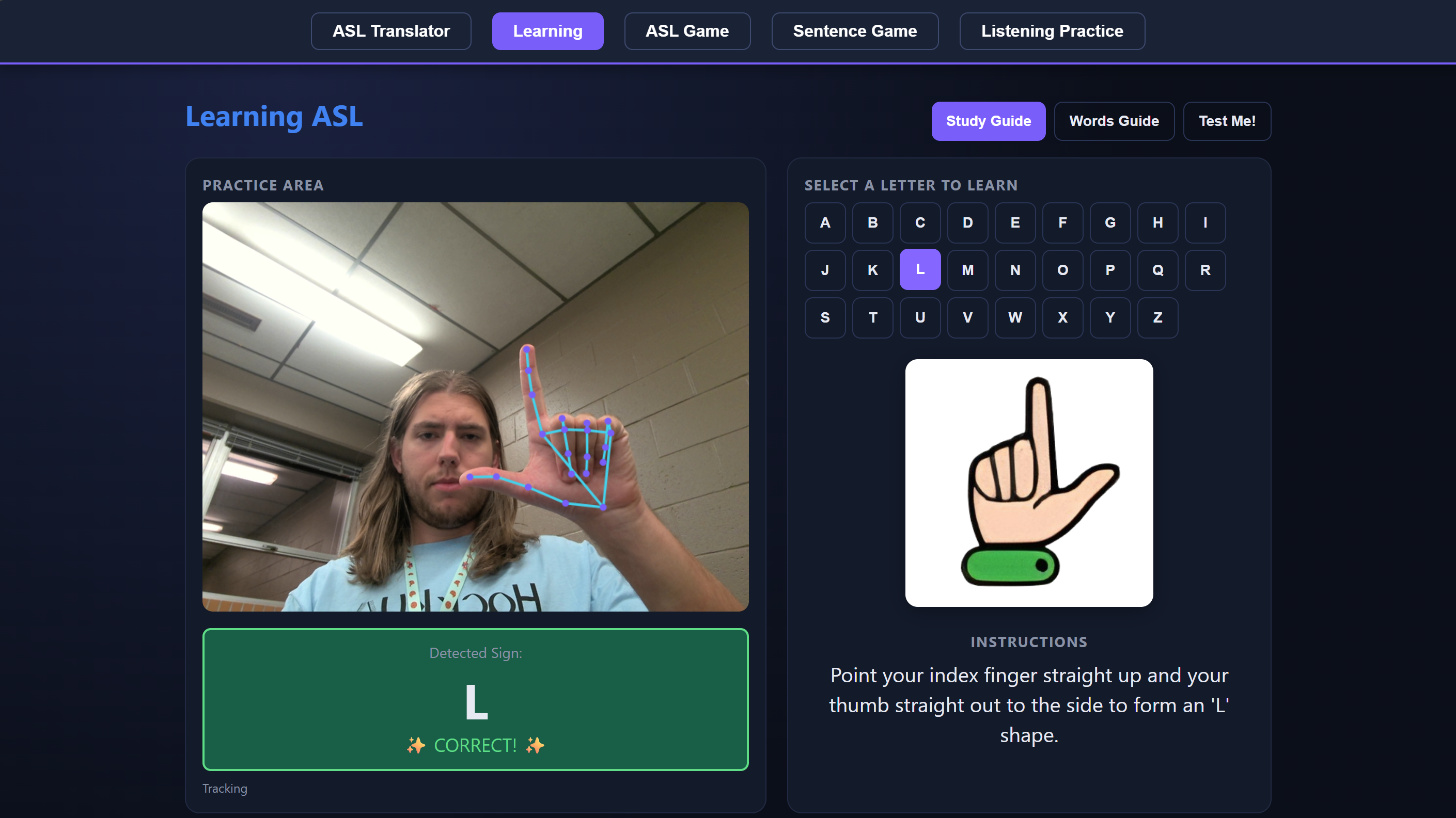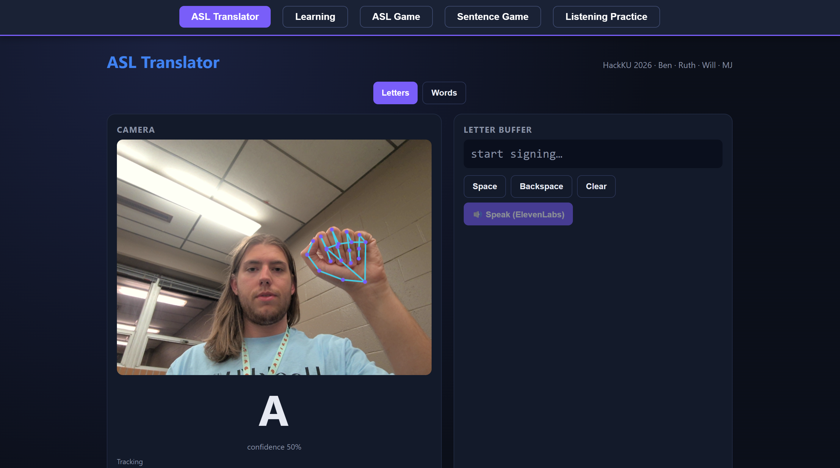 Over 70 million people worldwide use sign language as their primary form of communication, but most hearing people don't know a single sign. We wanted to shrink that gap using nothing more than the webcam already built into every laptop. The idea was to build something that works in both directions: a tool that translates ASL into English, and also helps hearing users learn to sign themselves. A one-way translator felt like half a product, so we set out to build both sides.