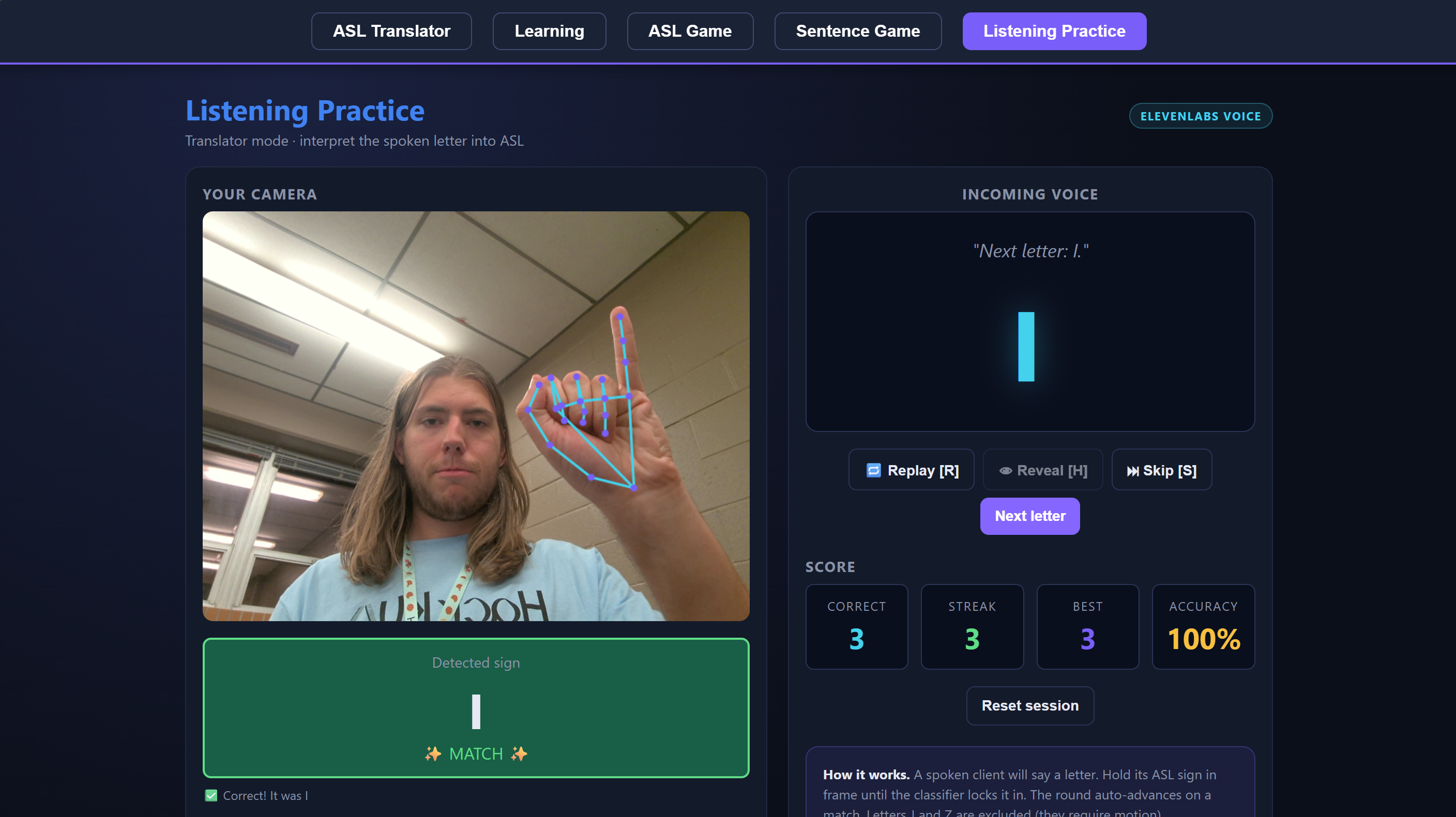 The Translator lets you sign letters or full words into your webcam, assembles what you sign into an English sentence, and then reads it out loud. Learning is a guided walkthrough of the alphabet and 20 common signs, with written instructions for each handshape. ASL Game is Hangman, except every guess is a sign. The Sentence Game gives you a fill-in-the-blank puzzle you solve by signing the missing word. And Listening Practice flips the usual direction: the app speaks a letter and you sign it back, which is how hearing users actually get better at signing.