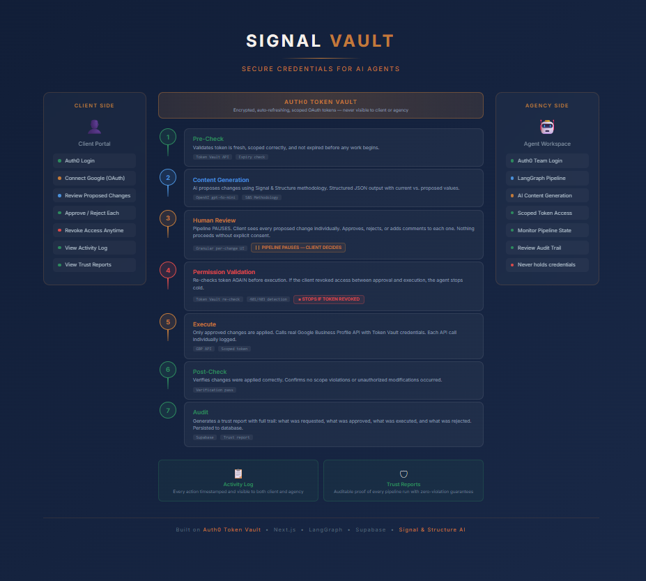 The 7-step pipeline is production architecture. Most hackathon entries demonstrate that Token Vault can issue a token. Signal Vault demonstrates what responsible token usage looks like — verification before action, human approval, re-validation before execution, post-execution checks, and immutable audit trails. This is the pattern we're building into our real client platform.