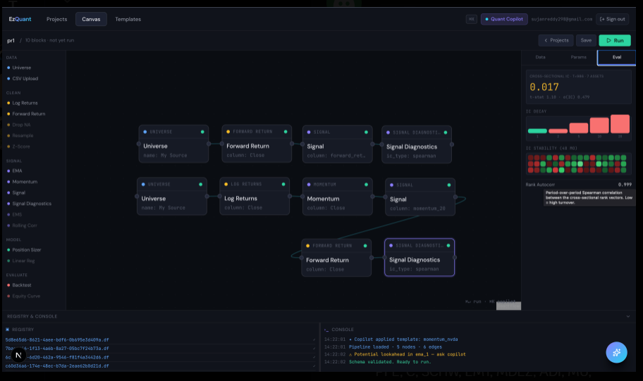 SignalTracer lets you drag and drop blocks onto a React Flow canvas to build a complete quant signal pipeline in under 90 seconds — from raw ticker data through log returns (with an ADF stationarity gate), momentum/EMA/GARCH models, and a clean signal, all the way to a realistic backtest with costs and trading-native metrics like Sharpe ratio, Information Ratio, and equity curves.