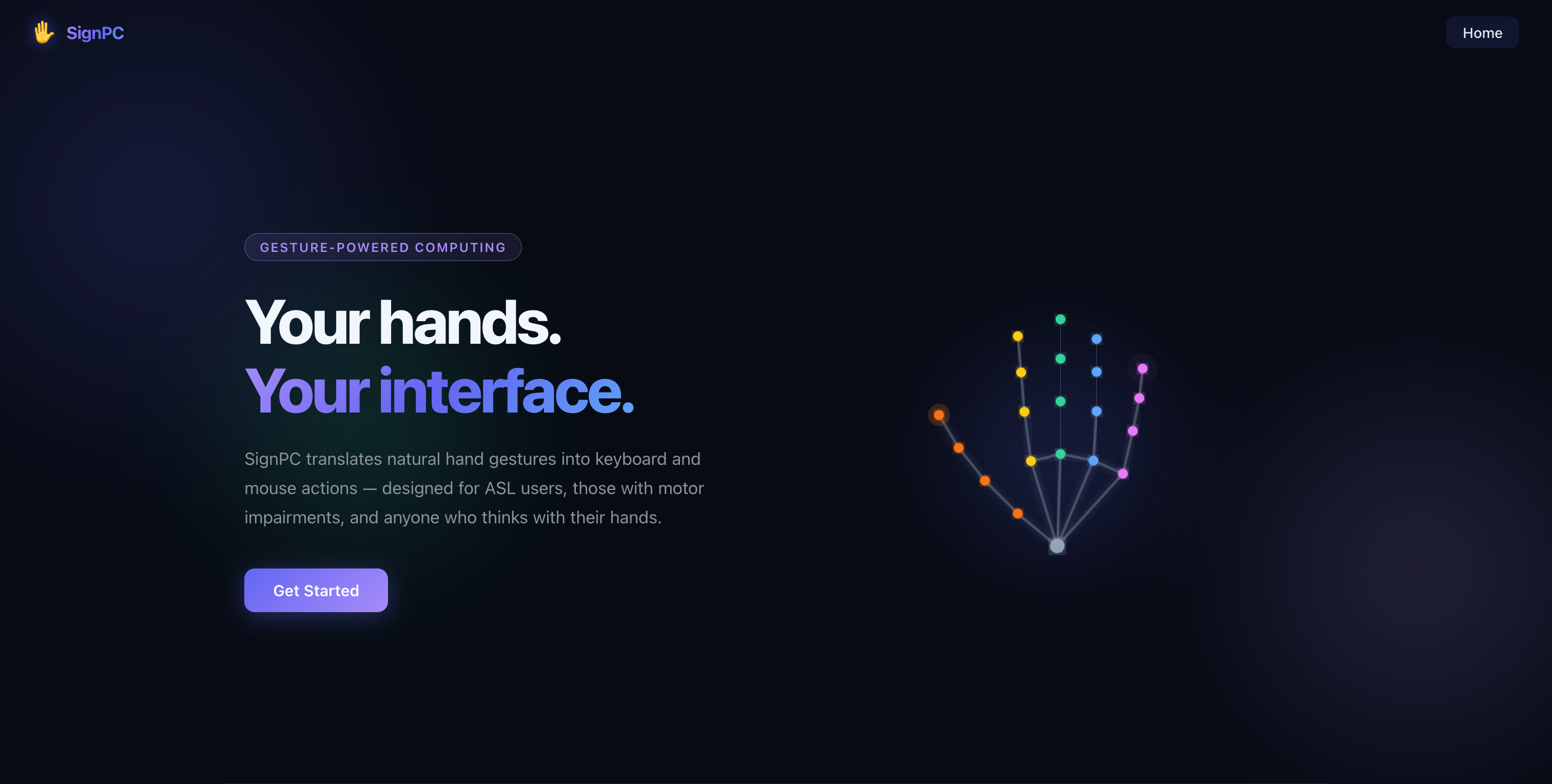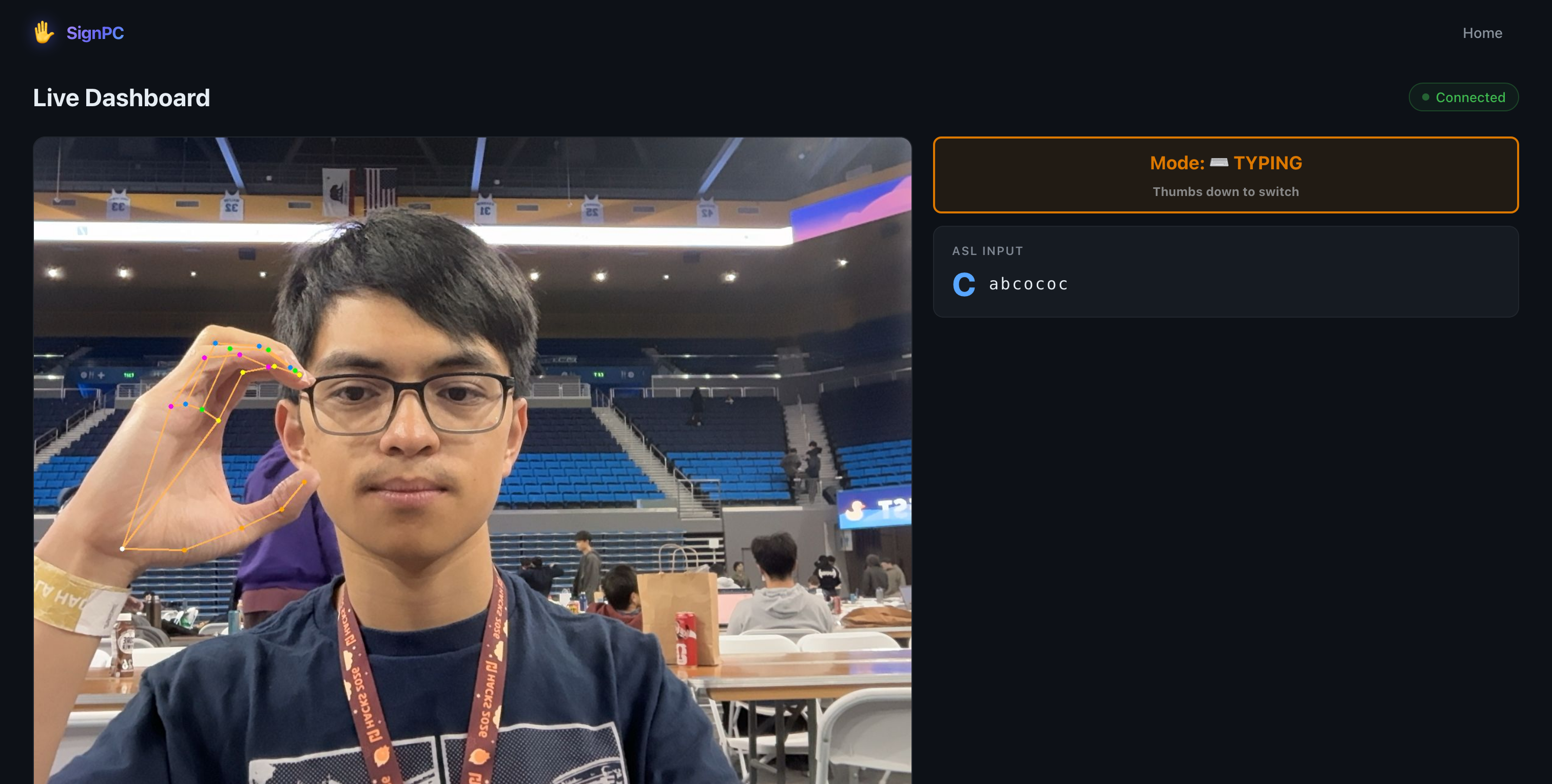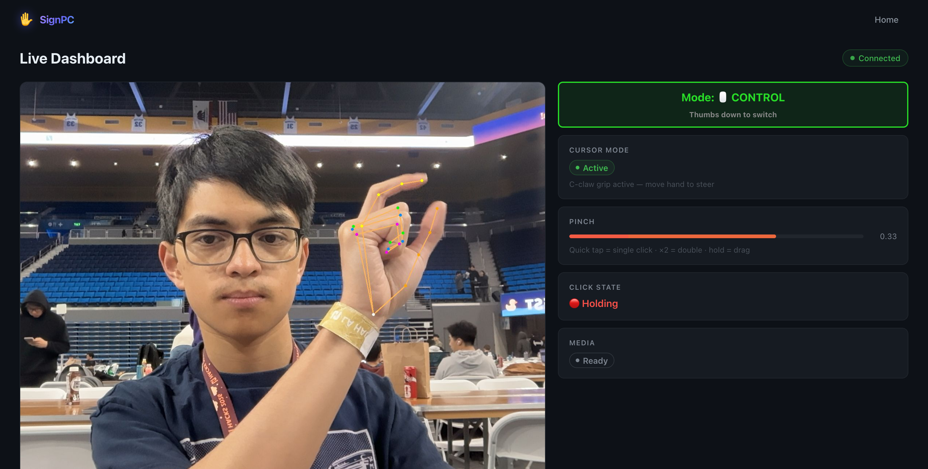 SignPC is a real-time gesture interface that lets you control your entire computer using only your hand and a webcam. It runs in two modes you can switch between on the fly. In Control mode, a C-claw grip activates the cursor and your hand position steers the mouse (weighted 80% toward your thumb tip for stability). Pinching fires a click, a double pinch fires a double-click, and holding the pinch drags. An open palm held for half a second plays or pauses media. In Typing mode, SignPC recognizes ASL fingerspelling in real time using an ML classifier, committing each letter after you hold the shape steady for a quarter second. Once you've spelled out a word, a thumbs-up sends the accumulated letters to an on-device Gemma 3 model, which autocorrects recognition errors and completes the intended phrase. Everything runs 100% locally at 30 FPS. No cloud, no account, no lag.