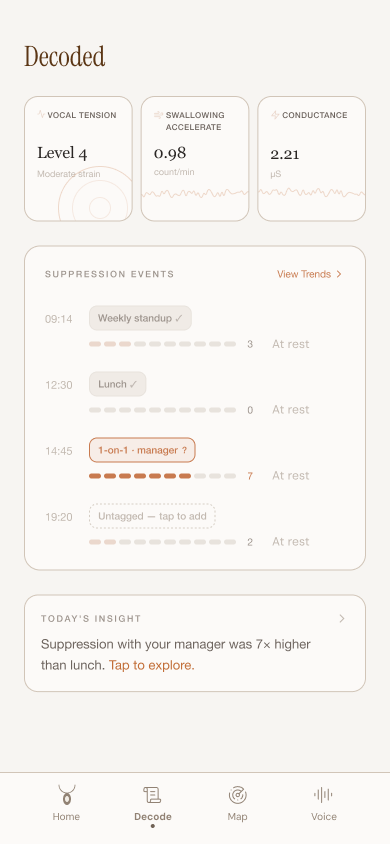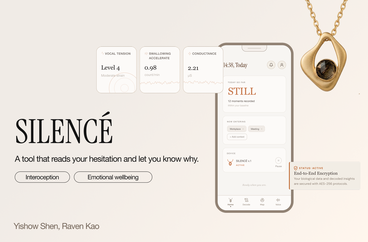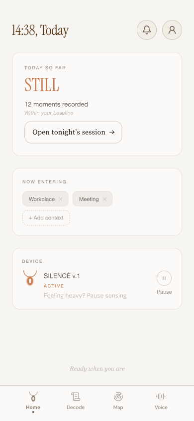 SILENCÉ is a biometric necklace + app that detects suppressed speech events — moments when your body begins to form words, but you don't speak them. The necklace reads EMG, PPG, EDA, and sub-vocal signals. When suppression is detected, it pulses once. Only you feel it. Not a notification — a new sense. The app has three flows: Daily Ritual (set context, review your silence timeline), Insight to Action (name what you carried, see patterns, get one small challenge), and Safeguard (when the data says this week was heavy, quietly offer control — not resources).