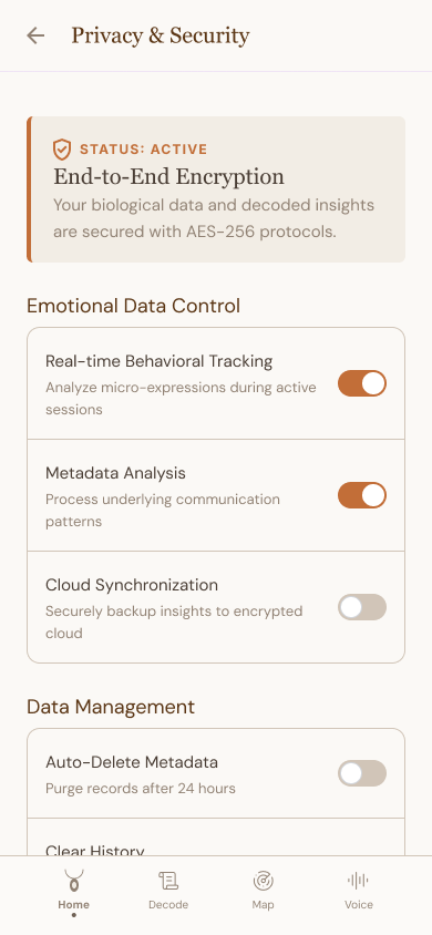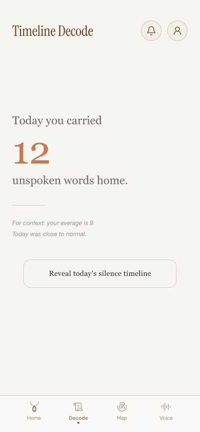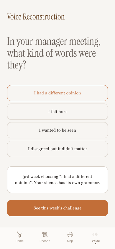 Naming a thing with no name. Suppressed vocality has no cultural vocabulary. Every word we tried carried the wrong weight. Avoiding the productivity trap. Every iteration pulled toward scores and streaks. We refused each one. The surveillance line. A tool that tracks when you almost speak is always listening. We designed explicit limits: timestamps only, no content, user-provided meaning, Privacy & Security as a first-class screen.