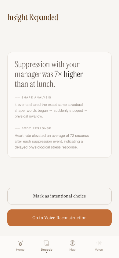 The shape glyph system — ╌╌▬▬╌╌ renders suppression as texture, not score The two-beat response — 400ms acknowledgement before 1200ms insight Copy that does real work: "No explanation needed." "Your grammar becomes a choice." Building a Safeguard flow whose safety feature is restraint
