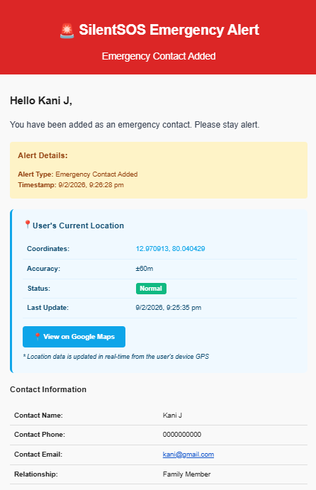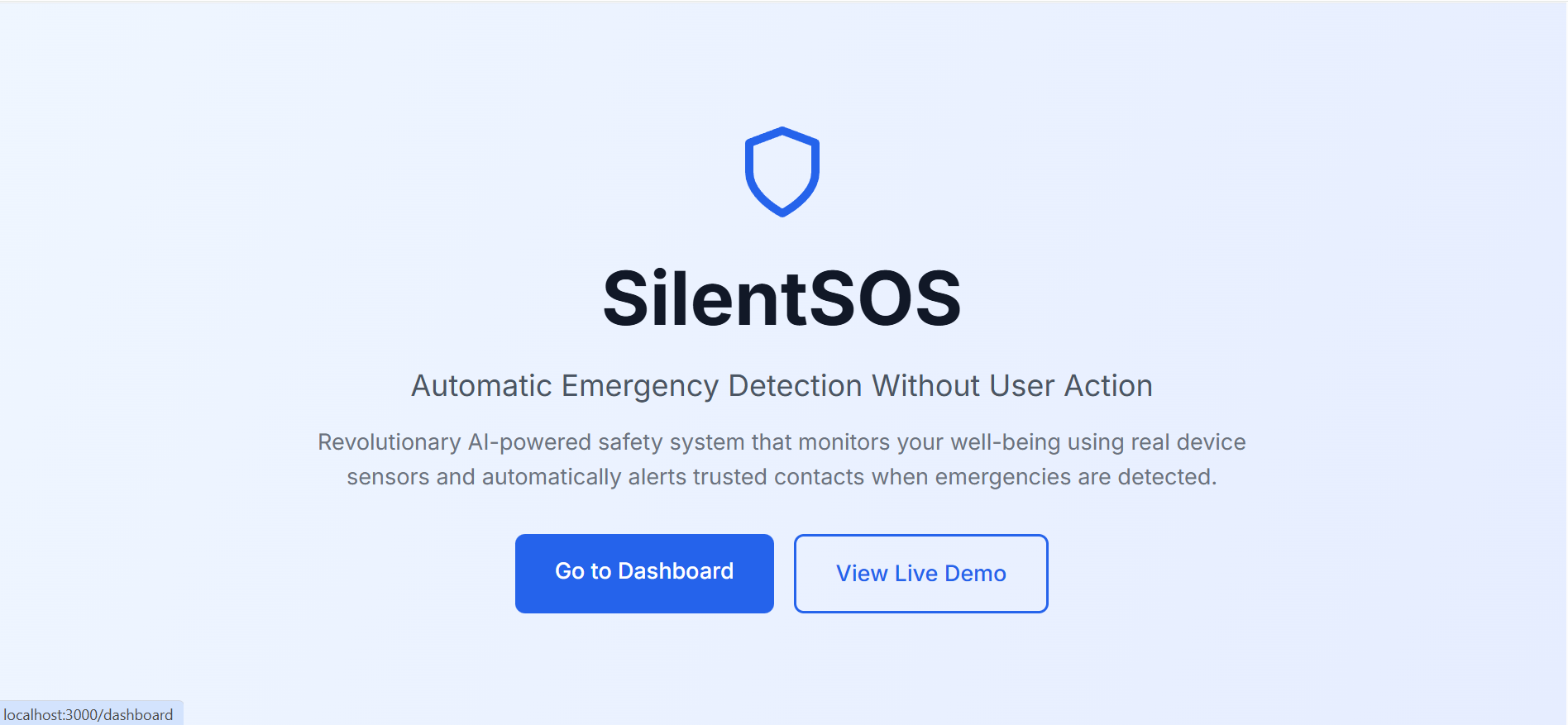 SilentSOS is a real-time safety web application that continuously monitors live device sensor data to identify potential emergency situations.It uses motion patterns to detect sudden impacts or prolonged inactivity, audio amplitude to identify distress sounds or extended silence and live location data to share accurate positioning. When multiple signals indicate danger, SilentSOS automatically triggers an SOS, alerts trusted contacts, and displays the event on a live dashboard all without requiring the user to press a button.
