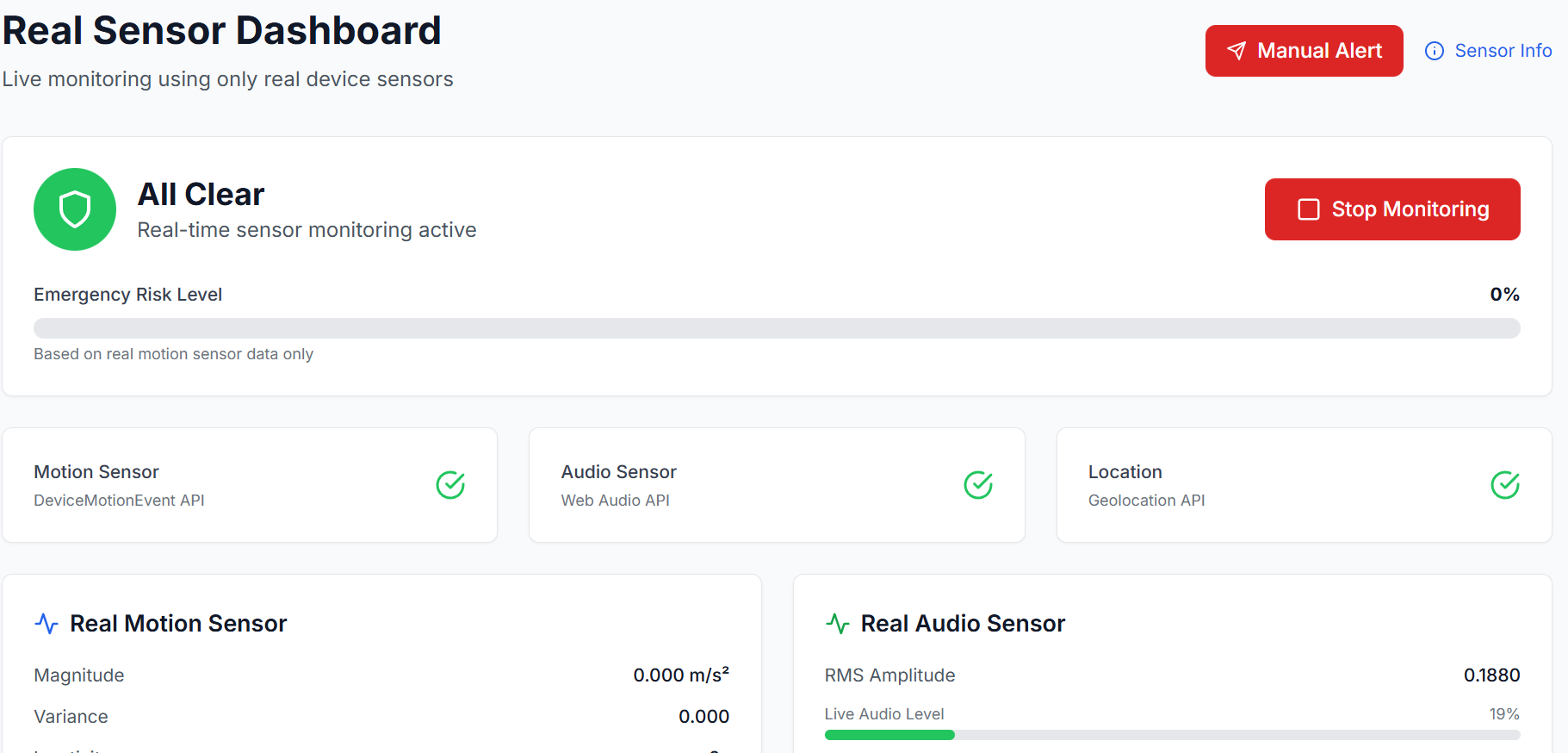 Built a fully functional automatic SOS system without relying on manual triggers Used only real device sensor data, with no simulations Designed transparent, explainable detection logic suitable for real-world use Created a live emergency dashboard with real-time map visualization Most importantly, the system prioritizes honesty and reliability over exaggerated claims.