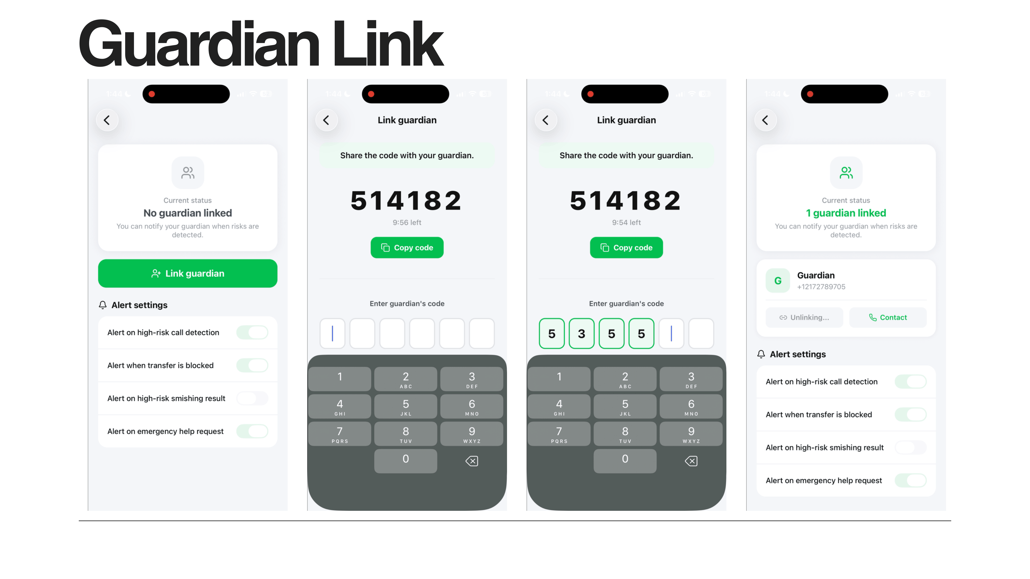- Guardian enters code
