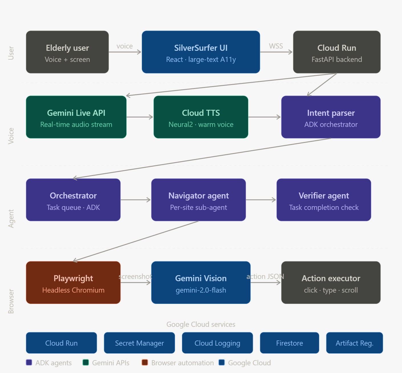 Sylvia — our agent persona — listens, understands, opens browsers, fills forms, clicks buttons, and confirms tasks. She narrates every step in a warm, calm voice. You never touch a keyboard. The agent pipeline At its core, SilverSurfer runs a continuous perception–action loop. Given the current screenshot, the current task, and prior context, Gemini 2.0 Flash outputs the next action as structured JSON: json{ "action": "click", "target": "calendar day 18", "x": 214, "y": 178, "narration": "I can see Tuesday the 18th — selecting it now." }