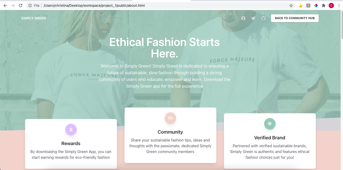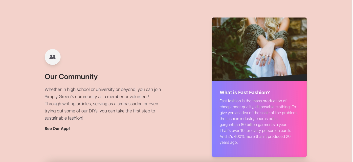 Simply Green tackles both education and tangible action. Too many apps focus on only action or education, which doesn't have the most effective results. Simply Green changes this. First, the app focuses on consumer tastes and actions - using incentives and appealing designs such as user-curated palettes and customizable feeds for the user made entirely of ethical, eco-friendly brands. Users are motivated to shop more sustainably because of how easy it is to find top brands that fit their style, and also DIY projects offer rewards such as discounts. This allows users to complete fashion projects and reuse, reduce, recycle through daily challenges where they can earn points for discount rewards! The second part, education, is centered around the website, where users can find trending articles and read about fast fashion. They can also find top 10 ethical brands, as well as blog posts from community members, building a sense of community with the green movement.