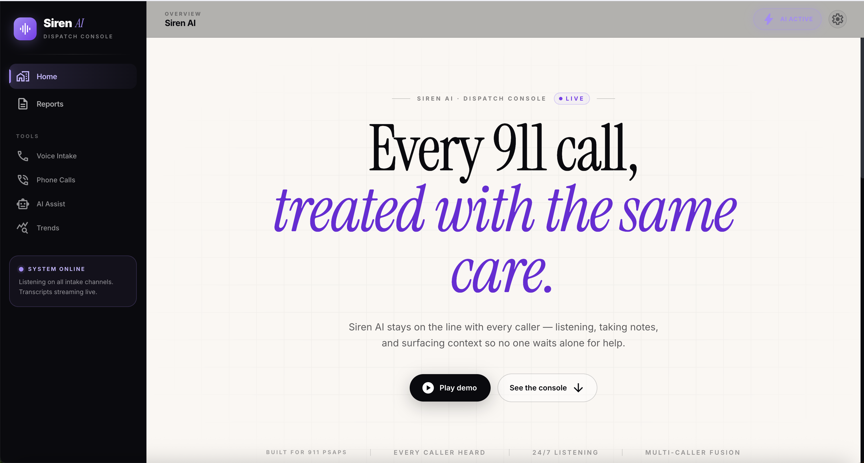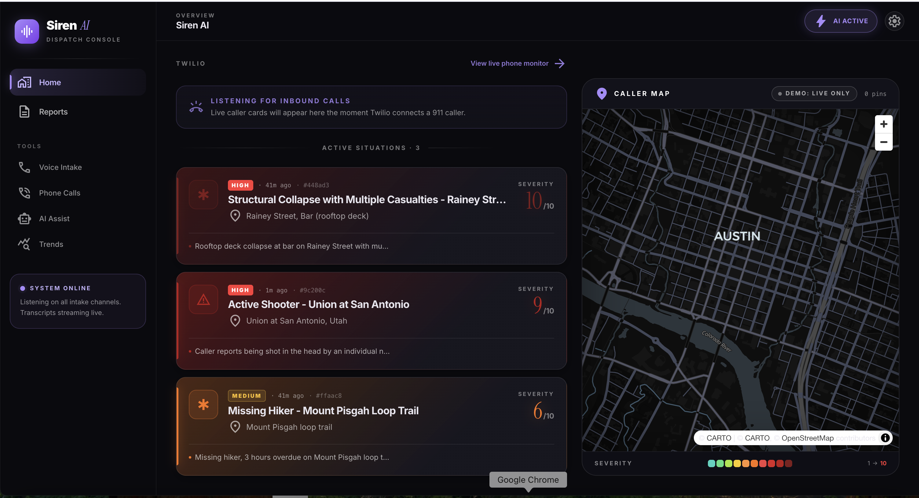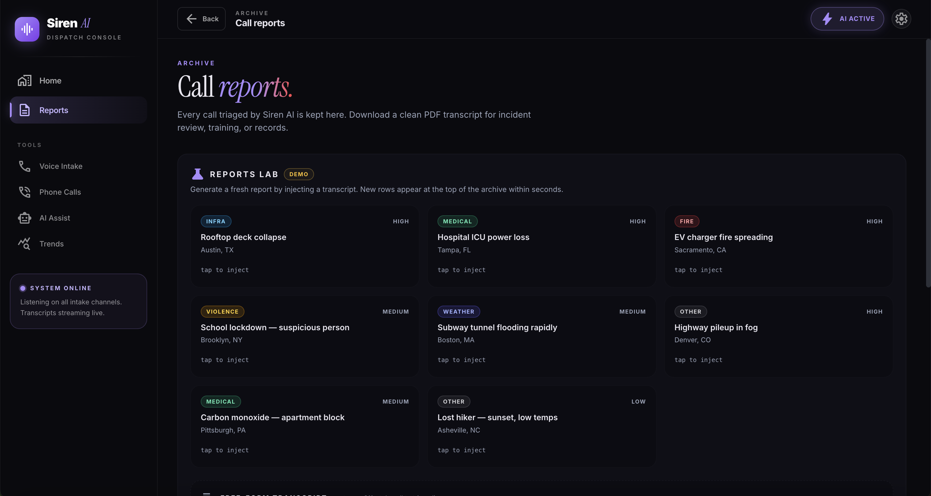 SIREN is an AI-assisted emergency intake system designed to step in immediately when a caller is placed on hold. Instead of waiting passively in silence, the caller can start describing what’s happening. As they speak, SIREN listens and builds a live, continuously updated report for the dispatcher. It instantly extracts critical information—such as the caller's location, the nature of the emergency, and its severity—so dispatchers have the context they need the second they pick up the line.