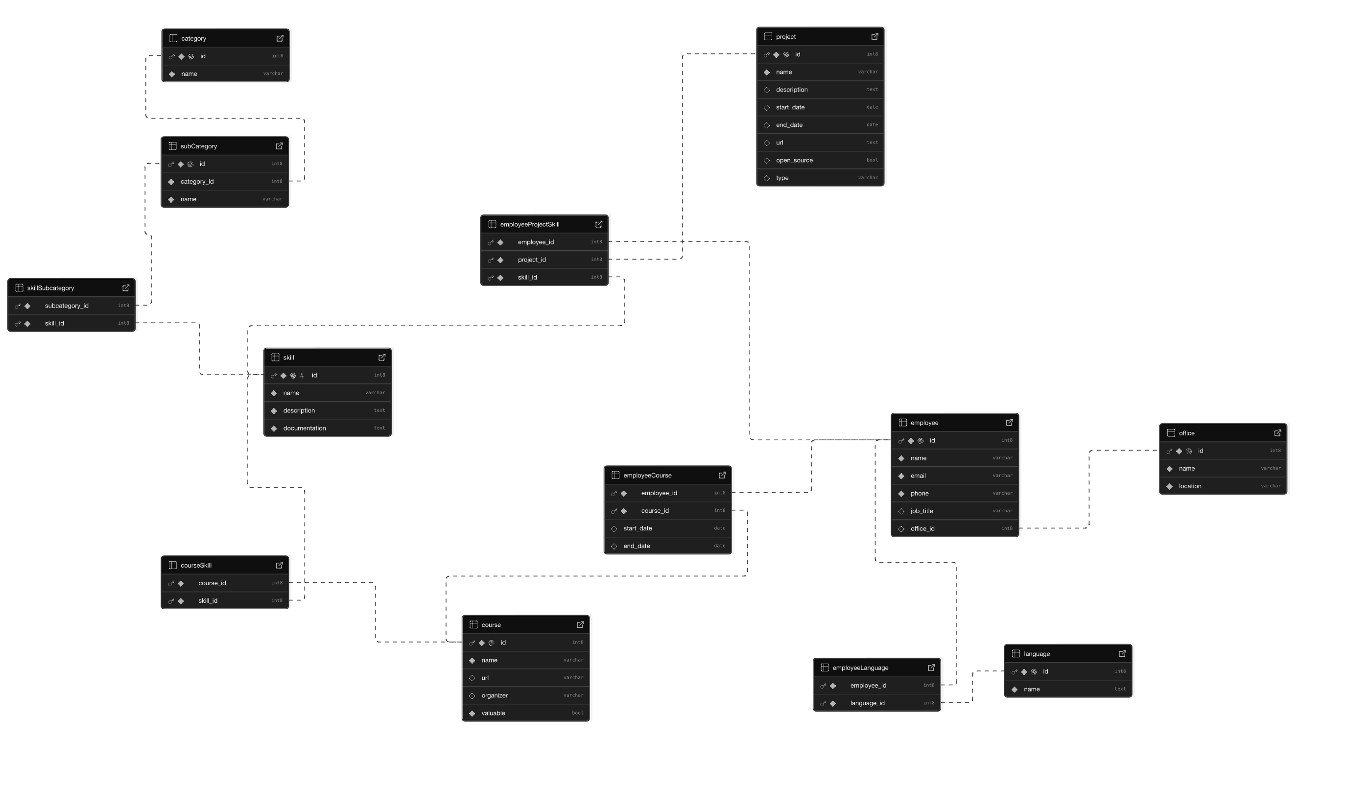 Creación del sistema de base de datos relacional para la extracción de información de las skills, qué empleados tienen experiencia con estas y cómo la han conseguido, ya se a través de cursos, proyectos personales o de la empresa. Además, para registrar su información de contacto que permite a cualquier empleado de Gradiant poder comunicarse con él mediante correro o teléfono. Para ello, se utilizo la herramienta de la nube Supabase, que pemitió el trabajo colaborativo para el desarrollo de las relaciones. También, se definieron queries pre-fabricadas para automatizar la recopilación de información.