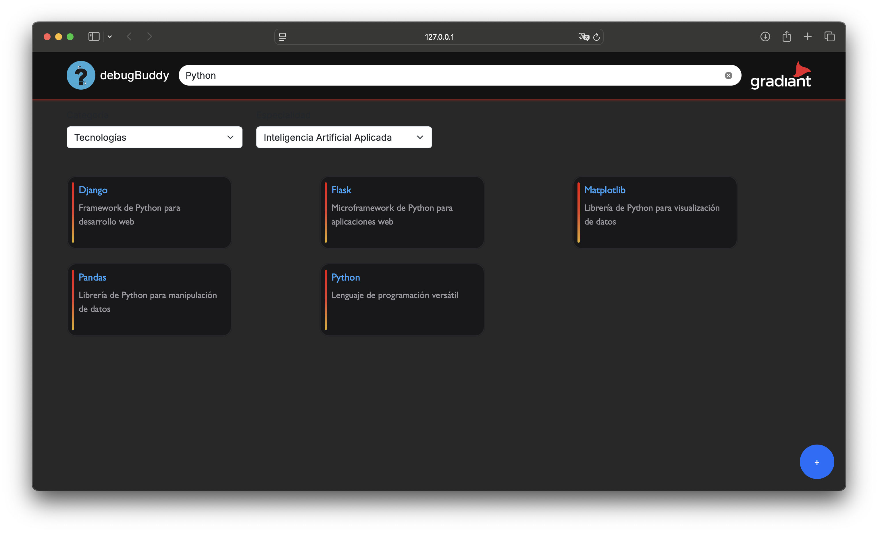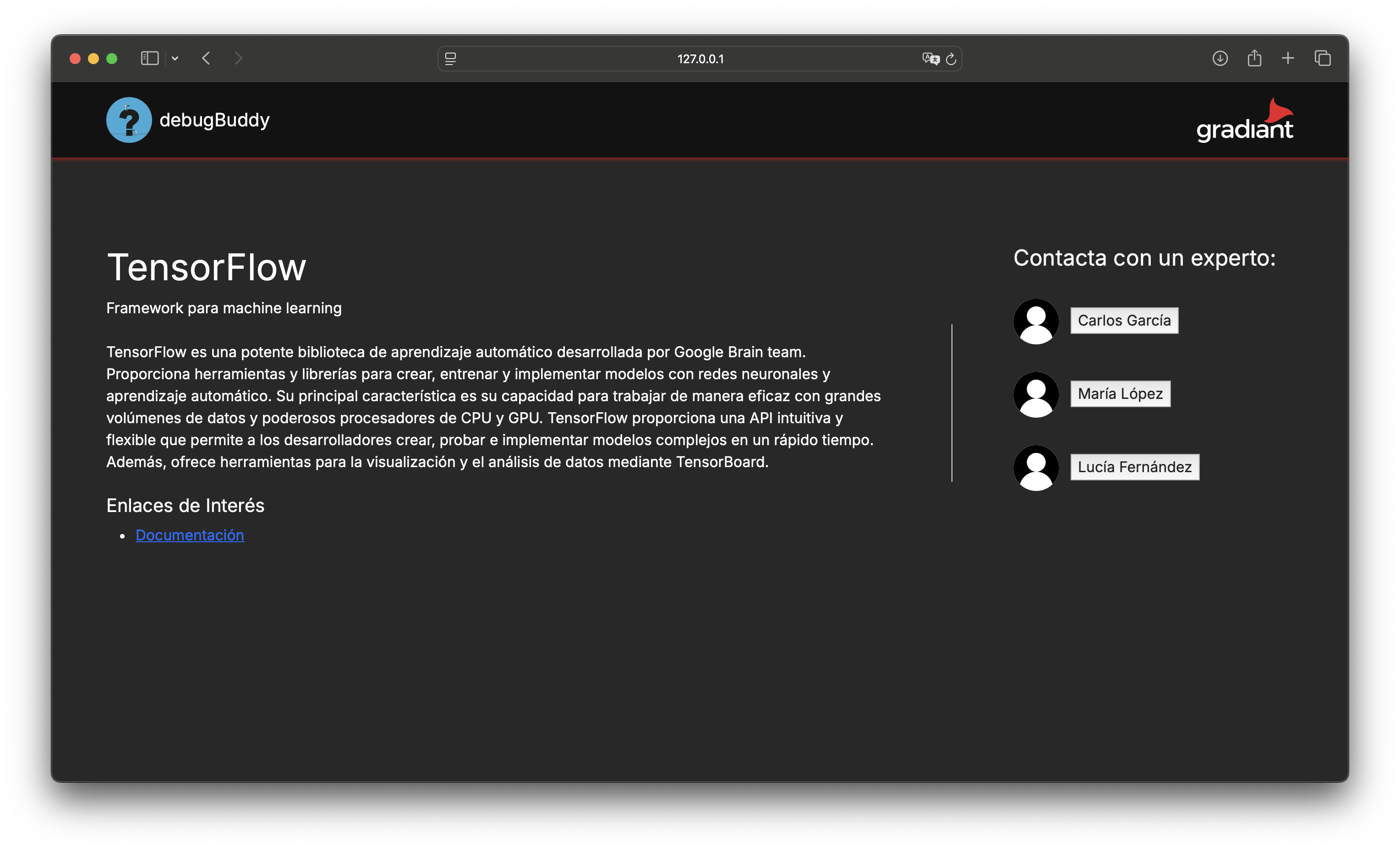 El problema descrito anteriormente es que se busca solucionar a partir de esta interfaz web, que se basa en un buscador de empleados cualificados para el uso de una tecnología particular. Esta información resulta valiosa para que un directivo sepa a quién contactar para un cierto proyecto y así conseguir el máximo rendimiento. Asimismo, estos empleados pueden de ser gran ayuda para asesorar a aquellos que no cuentan con la experiencia suficiente, ayudando así a Gradiant a ser una organización con trabajadores que están en la vanguardia en la industria tech.