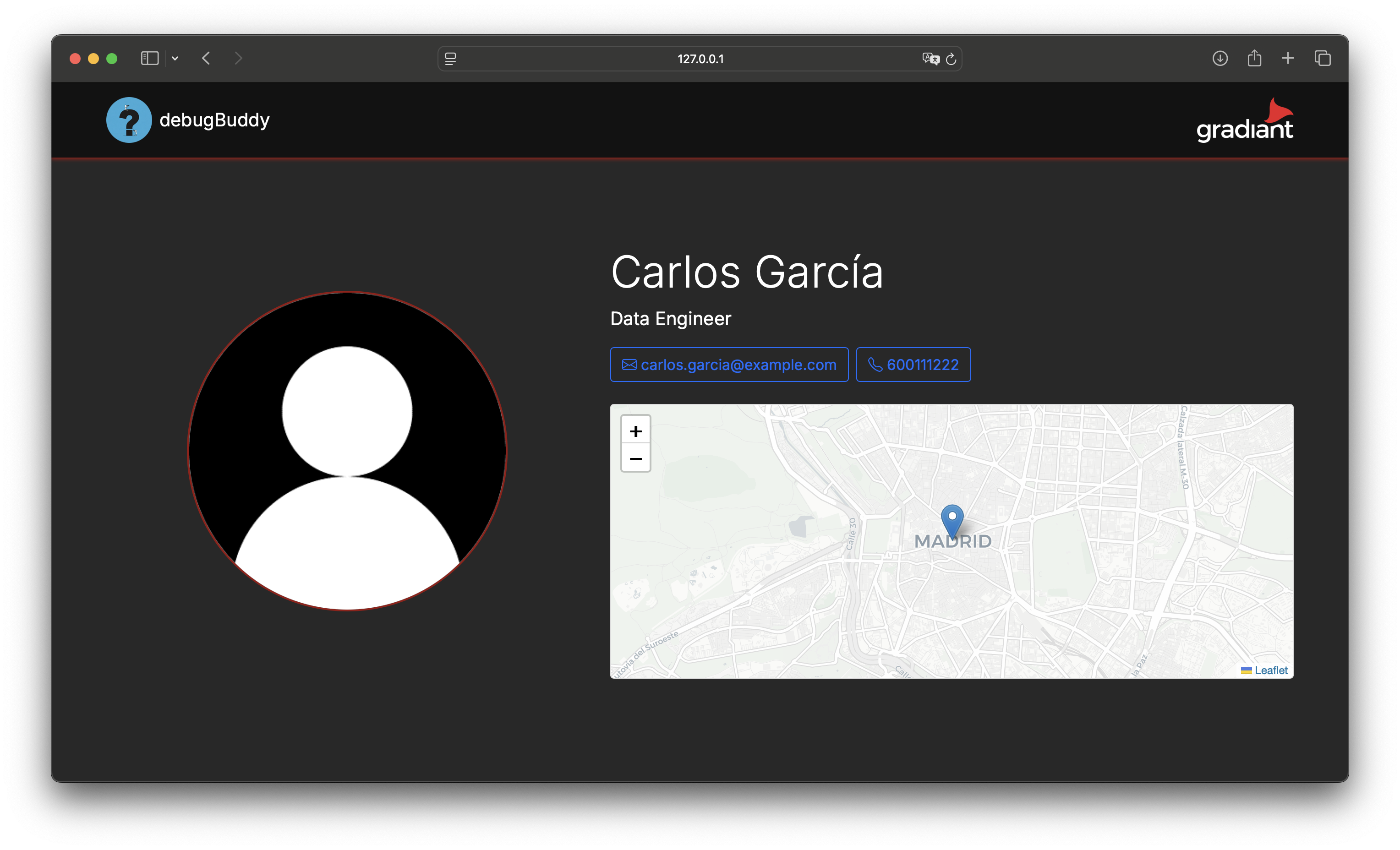 Después del desarrollo de la lógica subyacente para la extracción de la información. A partir del framework Flask de Python para la creación de APIs que permitan la transferencia de información del back-end al fronted, así como para definir las URLs principales del sitio web. También, se utilizó el lenguaje de marcas y de diseño HTML y CSS, así como JS para añadir interacción. El principal objetivo para el diseño de esta interfaz web es que cualquier directivo de Gradiant pueda ver las destrezas más importantes que se utilizan en la compañía y a quién/es puede/n recurrir, de una manera fácil y sencilla.