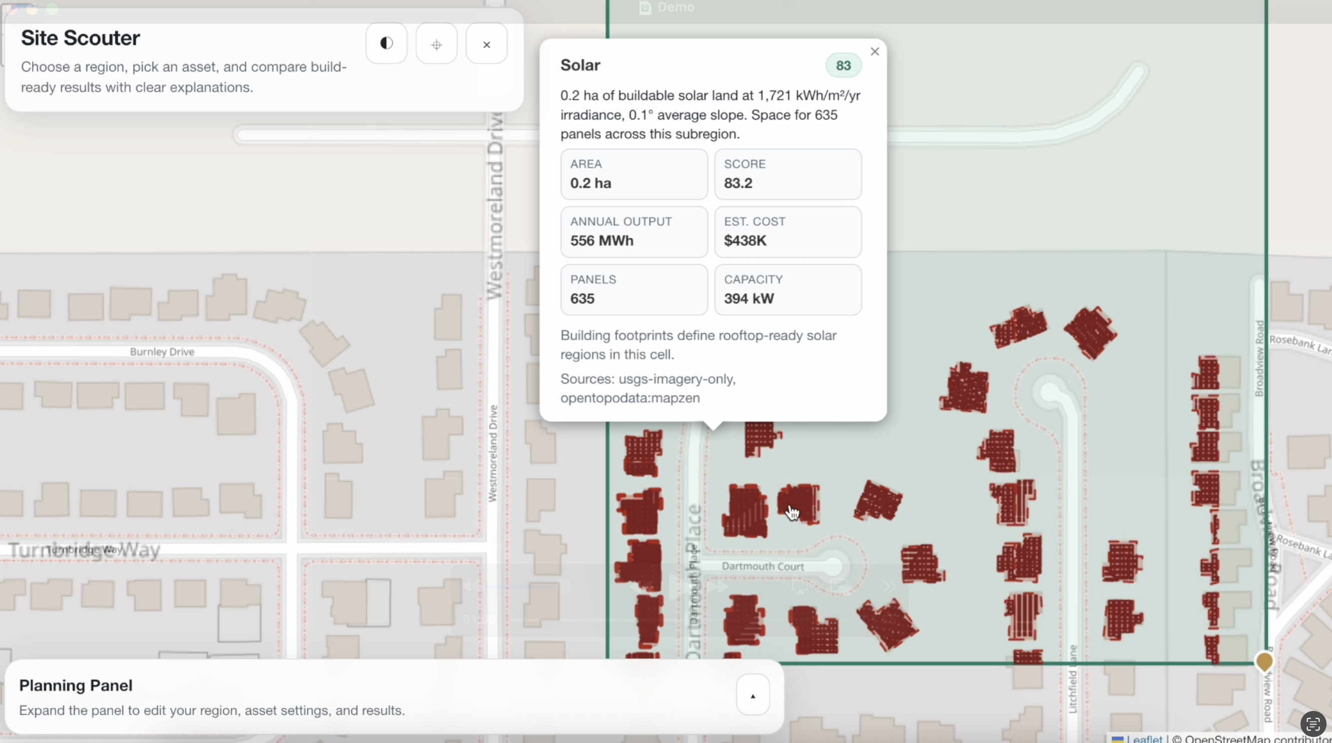 Site Scouter is a geospatial analysis tool that takes a user-defined region and identifies the best areas for infrastructure by subdividing the selected region into smaller cells, then analyzing it using satellite imagery, terrain, and vector data, and scoring suitability for solar panels, wind turbines, and data centers based on factors like irradiance, land cover, slope, obstructions, and accessibility. The platform then ranks and visualizes the best candidate areas on an interactive map, while also supporting single-asset analysis with estimated output, cost, and past-year generation trends.