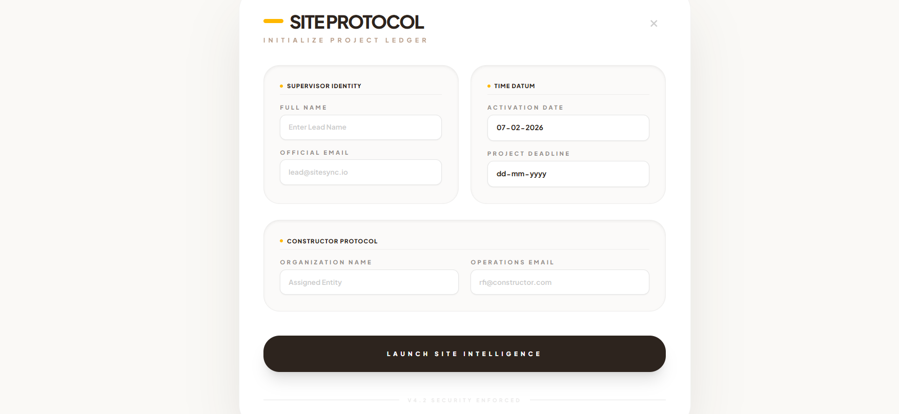 - **Site Protocol (Project Initiation): A responsive, boxed onboarding form to establish the project ledger, supervisor identity, schedule datums, and assigned constructor details.