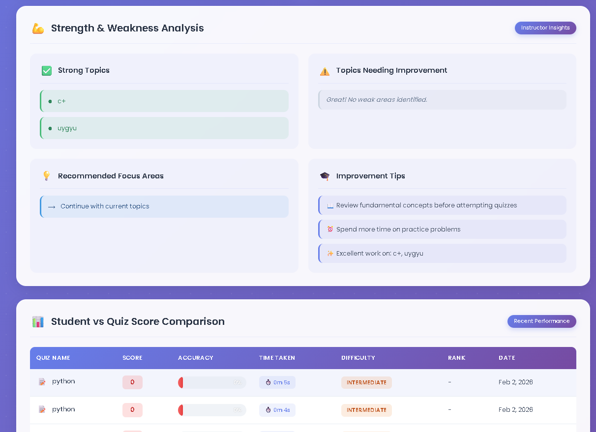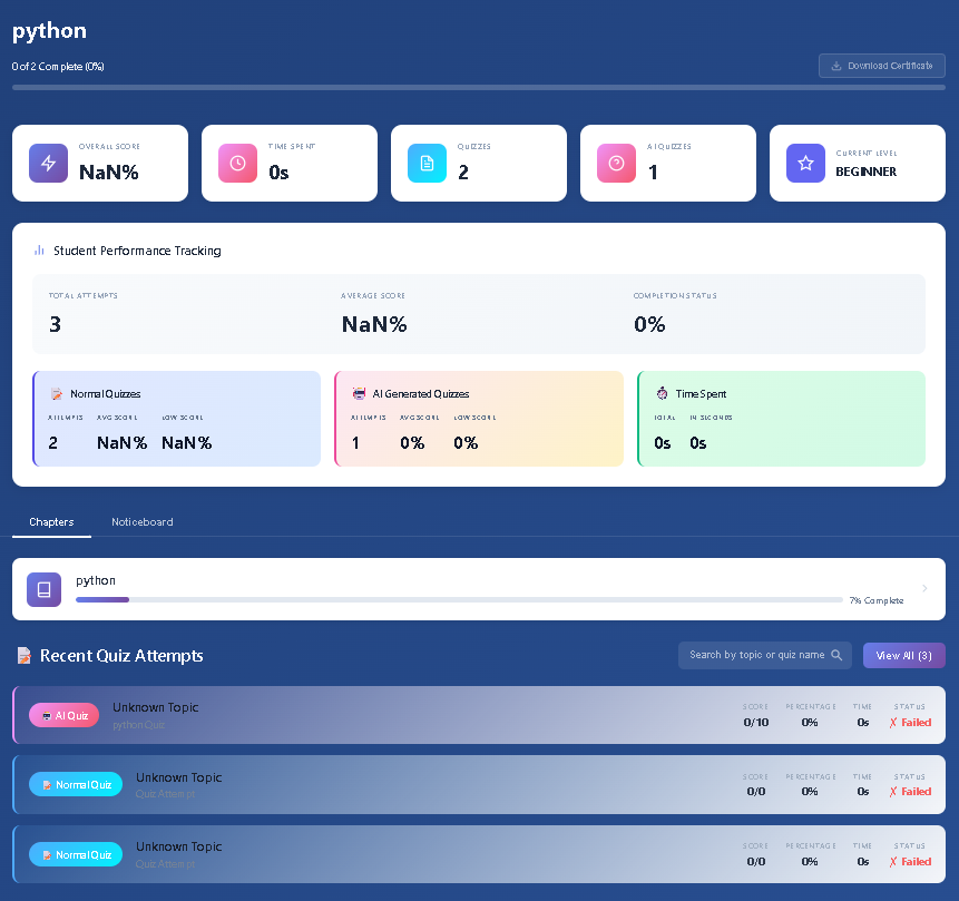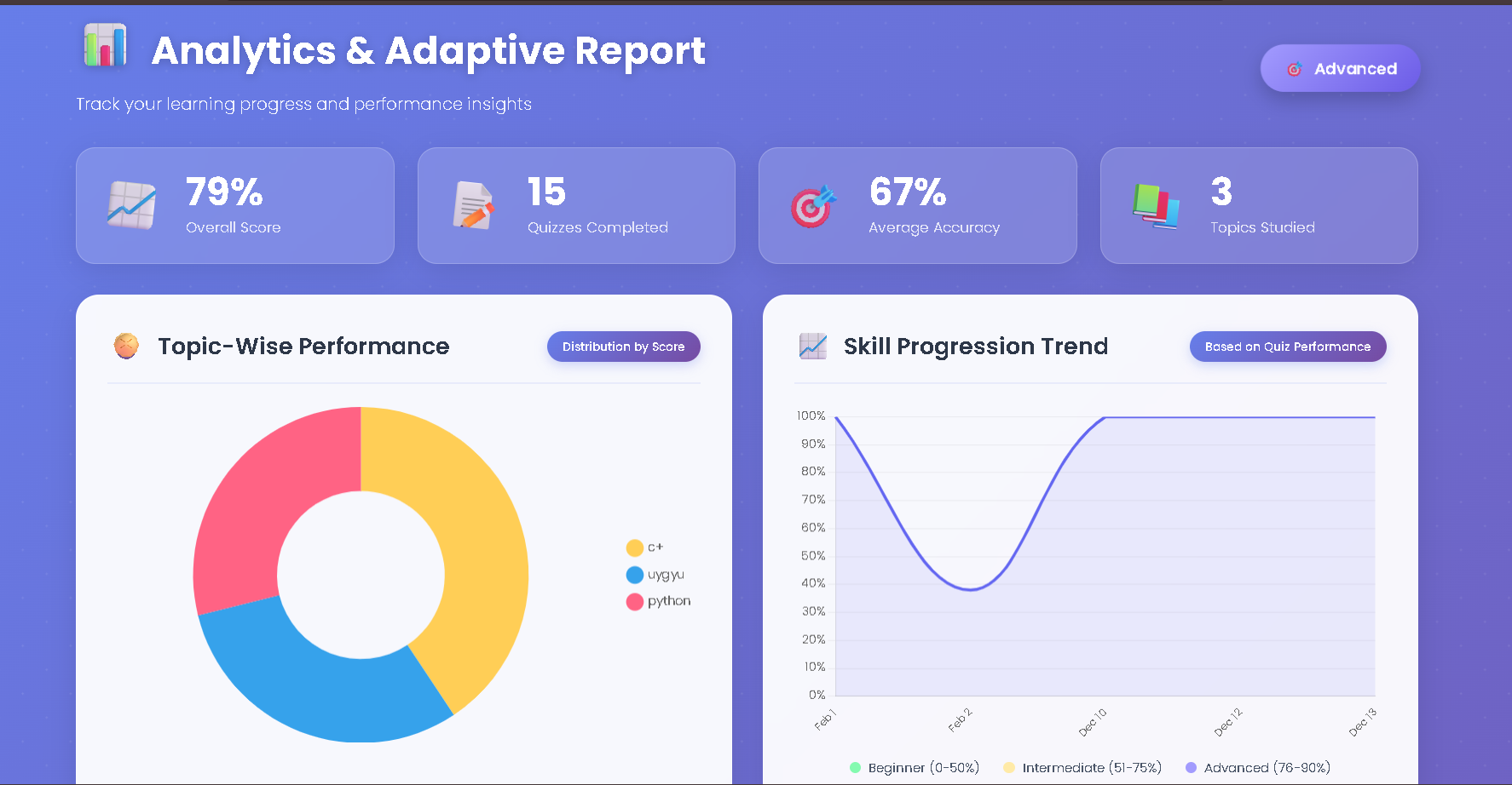 Designing accurate AI-based quiz generation Building a proper adaptive learning algorithm Managing real-time performance analytics Ensuring smooth integration between frontend, backend, and AI APIs Creating a clean and user-friendly dashboard UI