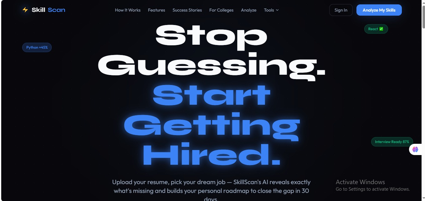 SkillScan is an AI-powered career intelligence platform that tells students exactly what stands between them and their dream job — then builds a personalized roadmap to close that gap in 30 days.