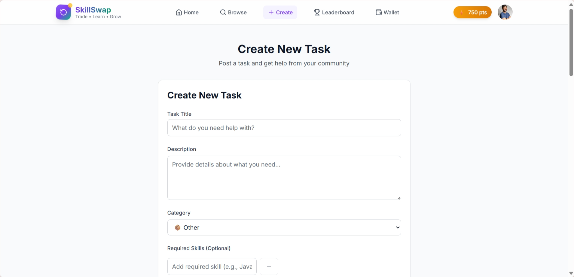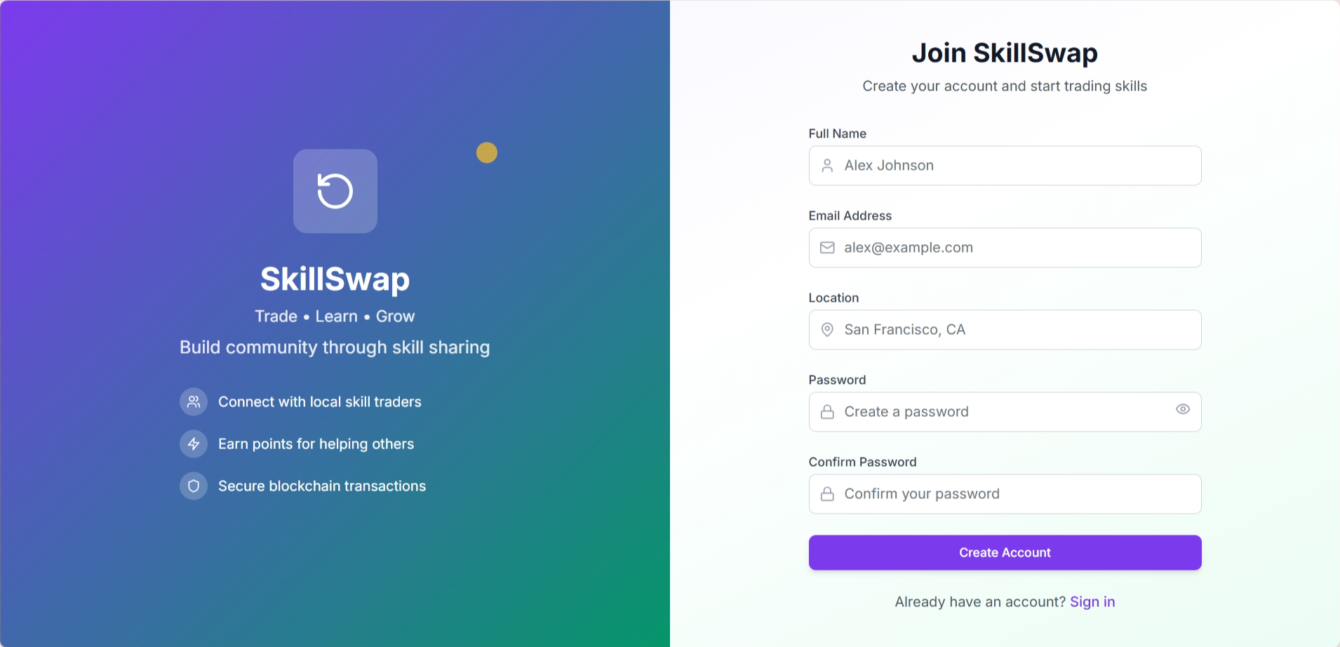 🌟 Inspiration The idea for SkillSwap was born from seeing how people in local communities have valuable skills but often lack easy, affordable ways to exchange them. With the rising cost of living, we wanted to create a platform that enables neighbors to help neighbors — no money required. We imagined a tool that builds stronger communities, fosters trust, and reduces dependency on cash transactions.