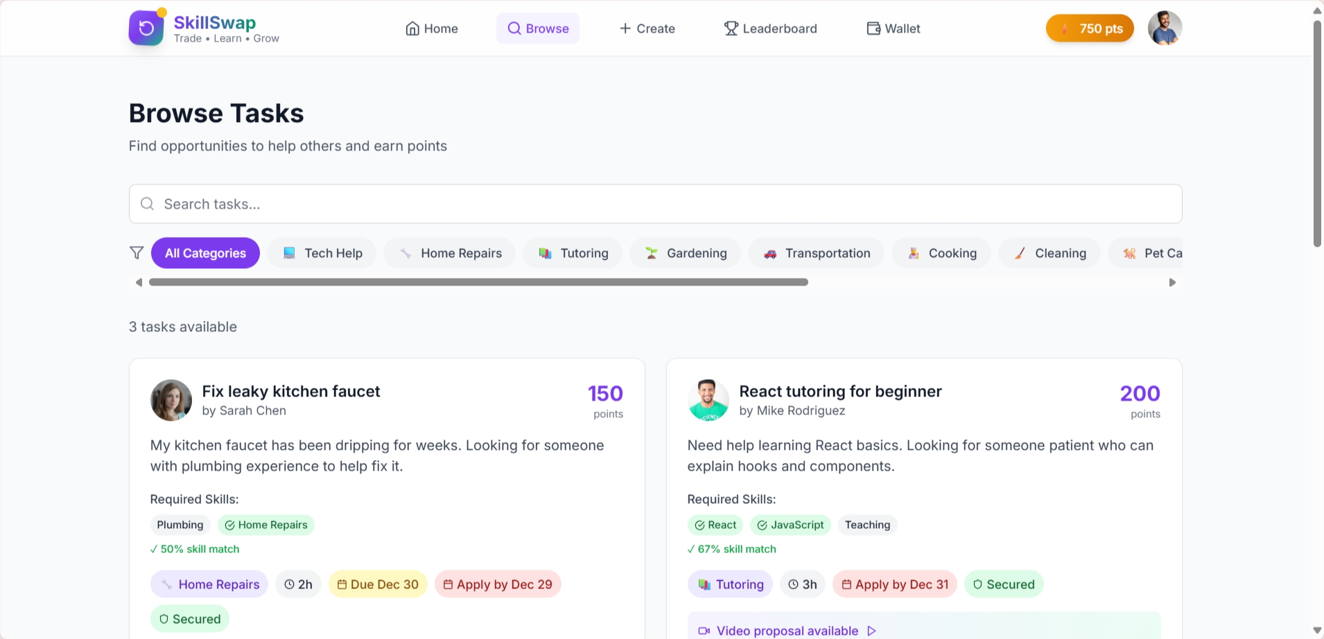Users post tasks or skills they can offer.