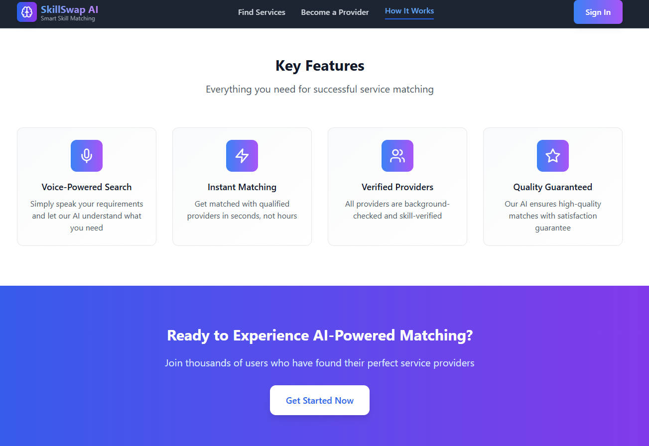 🎯 Core Innovation 🤖 Advanced AI Matching: Uses Hugging Face Transformers for intelligent provider-client matching 🔒 Comprehensive ID Verification: Multi-country ID verification system with document upload 🗣️ Voice-Powered Search: Natural language processing for voice and text queries 🎨 Stunning UI/UX: Hackathon-winning design with dark/light mode toggle ⚡ Real-time Everything: Live messaging, notifications, and status updates 🔐 Authentication-Gated Contact: Secure contact system requiring user authentication 🚀 Key Features 🔐 Security & Trust Multi-Country ID Verification 🇮🇳 Indian IDs: Aadhaar, PAN, Driving License, Voter ID 🌍 International: Passport, National ID, Social Security, Work Permit 📸 Selfie verification with document matching ⚡ Real-time verification status tracking Authentication-Required Contact Users must sign in to contact providers Secure messaging system Protected booking and payment flows Verified user interactions only 🤖 AI-Powered Intelligence Smart Matching Algorithm Intent classification with 94% accuracy Sentiment analysis for urgency detection Entity extraction for skills and location Semantic similarity matching using embeddings Fallback mode for reliable operation without AI models Natural Language Processing Voice search with speech recognition Multi-language support (12+ languages) Context-aware query understanding 💼 Complete Business Solution Provider Management Comprehensive onboarding with verification Skills assessment and categorization Portfolio and certification management Availability and pricing controls Client Experience AI-powered service discovery Real-time provider matching Secure booking and payment system Review and rating system
