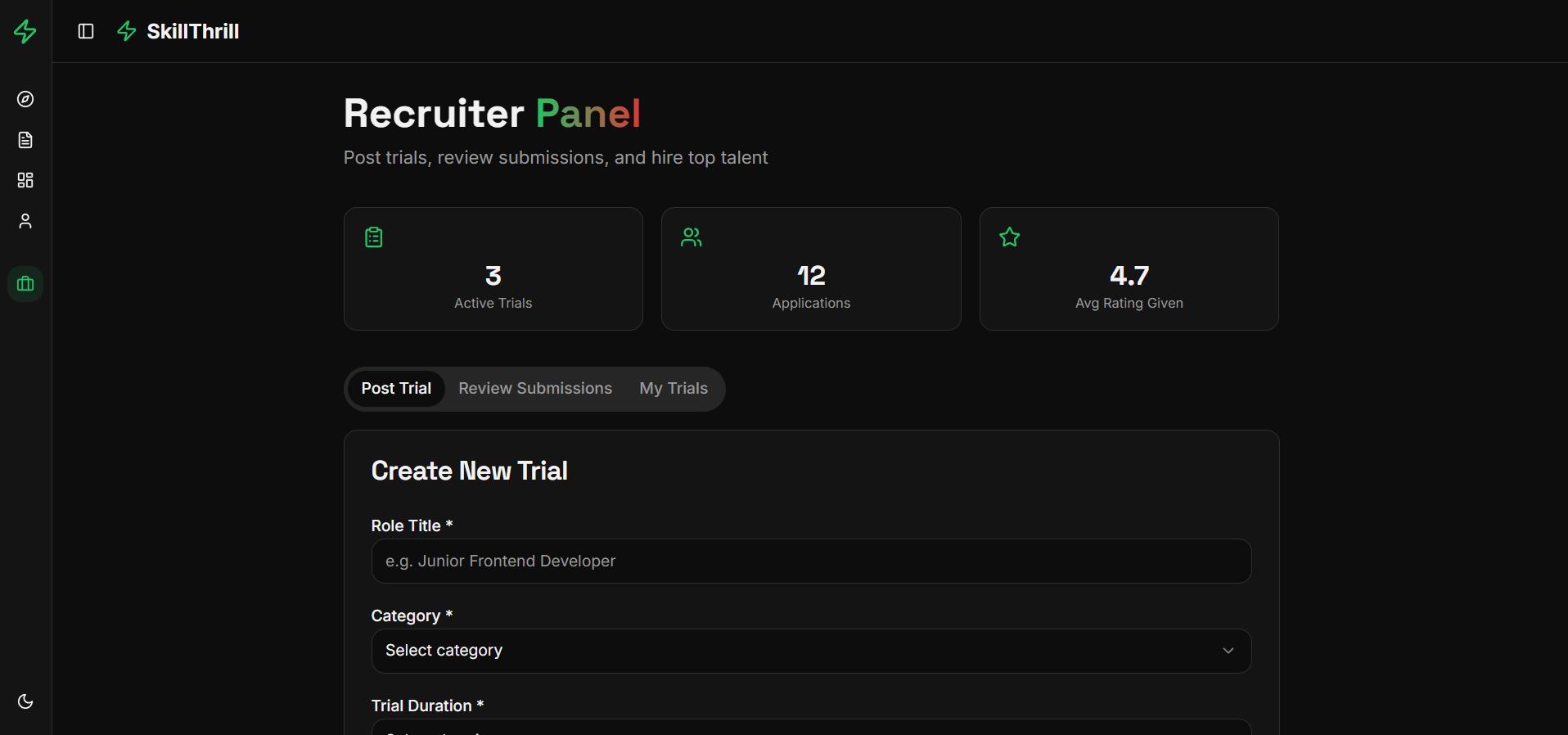 SkillThrill is an internship and job platform where users can apply without prior experience and prove their skills through real-world tasks. Instead of relying only on resumes, candidates complete short trial work, and recruiters evaluate them based on actual performance before hiring.