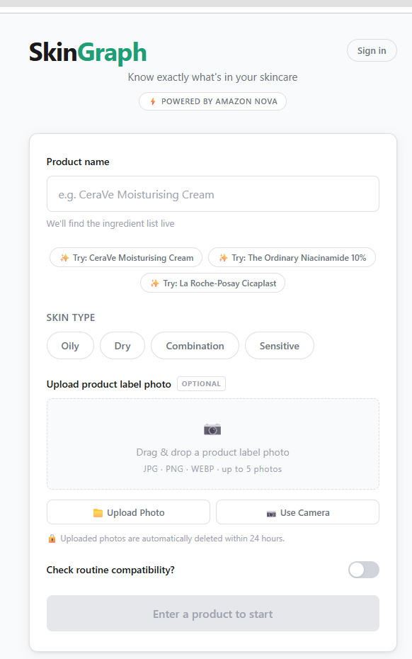 SkinGraph takes the guesswork out of skincare using Amazon Nova. You either type in a product name or upload a photo of an ingredient label. If you upload a photo, we use Amazon Textract to rip the text from the image, and Amazon Rekognition to detect what kind of product it is.