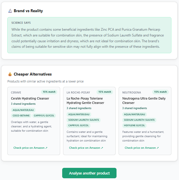 Then, Amazon Nova goes to work. It breaks down every single ingredient, scores the product from 0-100 based on your personal skin type (Oily, Dry, Sensitive, etc.), and flags hidden red flags like pore-cloggers or irritants. It even does a "Brand vs. Reality" check to see if the marketing claims actually match the science of the ingredients. Finally, it uses semantic search via Bedrock Embeddings to suggest cheaper alternatives with similar ingredient profiles.