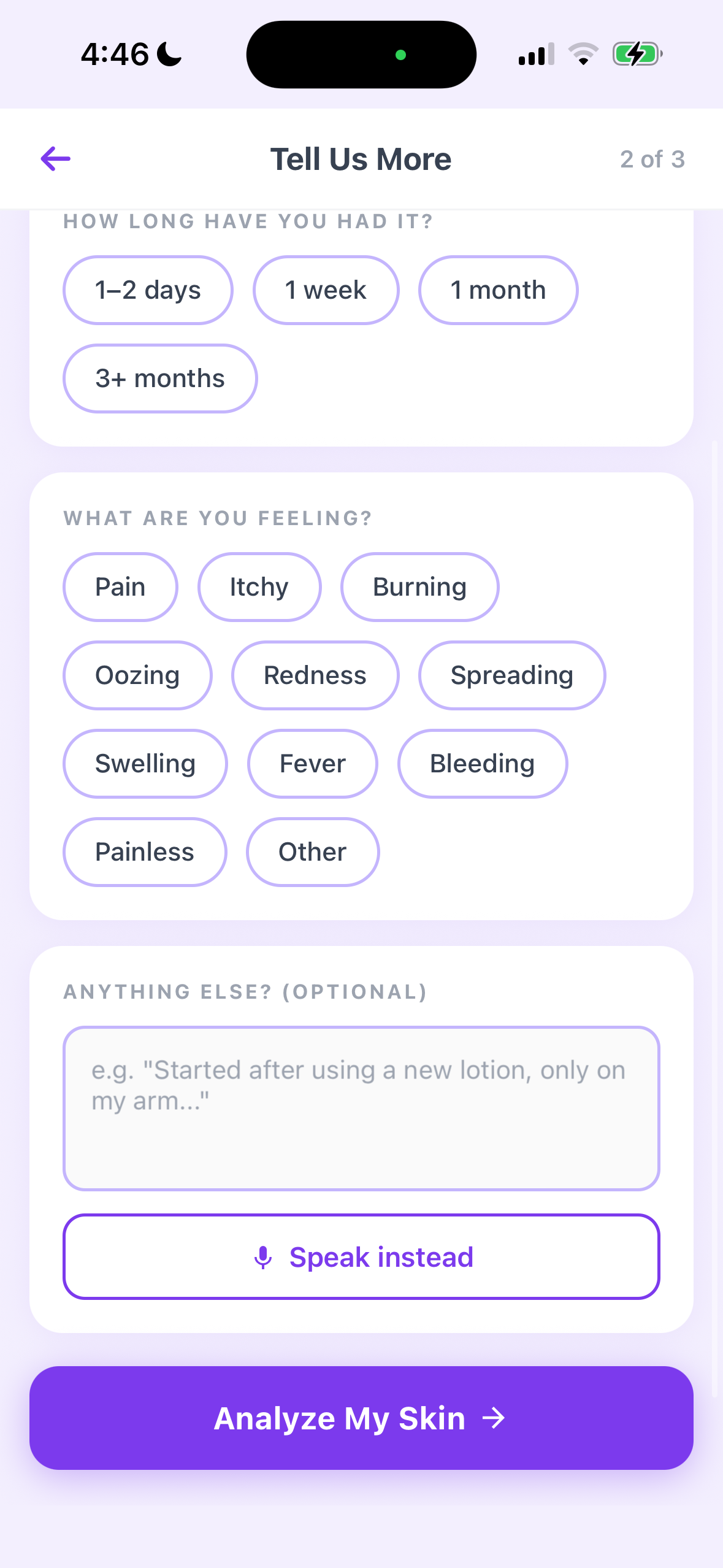 Skin conditions run in so many families, including some of ours, and watching family members struggle to get timely answers about rashes, lesions, and inflammatory conditions inspired us to build something that puts dermatology-level screening in everyone's pocket. Most people wait weeks for a dermatologist appointment for something that might be urgent. We wanted to change that, which is why we aimed to create a project tailored to the Catalyst for Care track at LA HACKS.