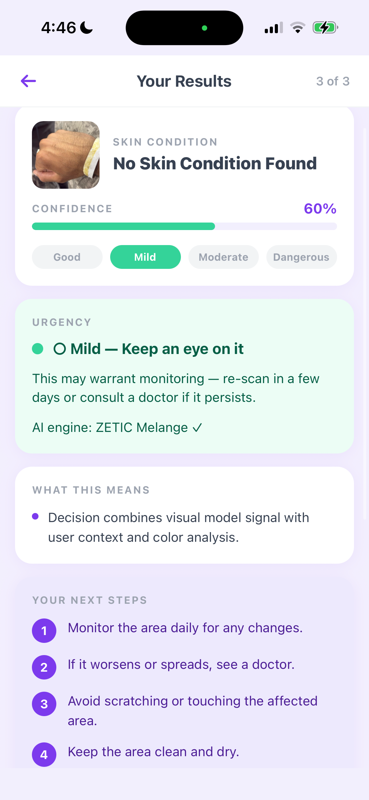 Getting a native Swift bridge to talk to React Native while using the ZETIC MLange SDK was the hardest part, the npm package was 9 months outdated so we built a custom RCT_EXTERN_MODULE Swift bridge from scratch. Training models that generalize across skin tones and lighting conditions was also tough with limited labeled data, and getting sub-second inference on a real device required aggressive image preprocessing optimization.