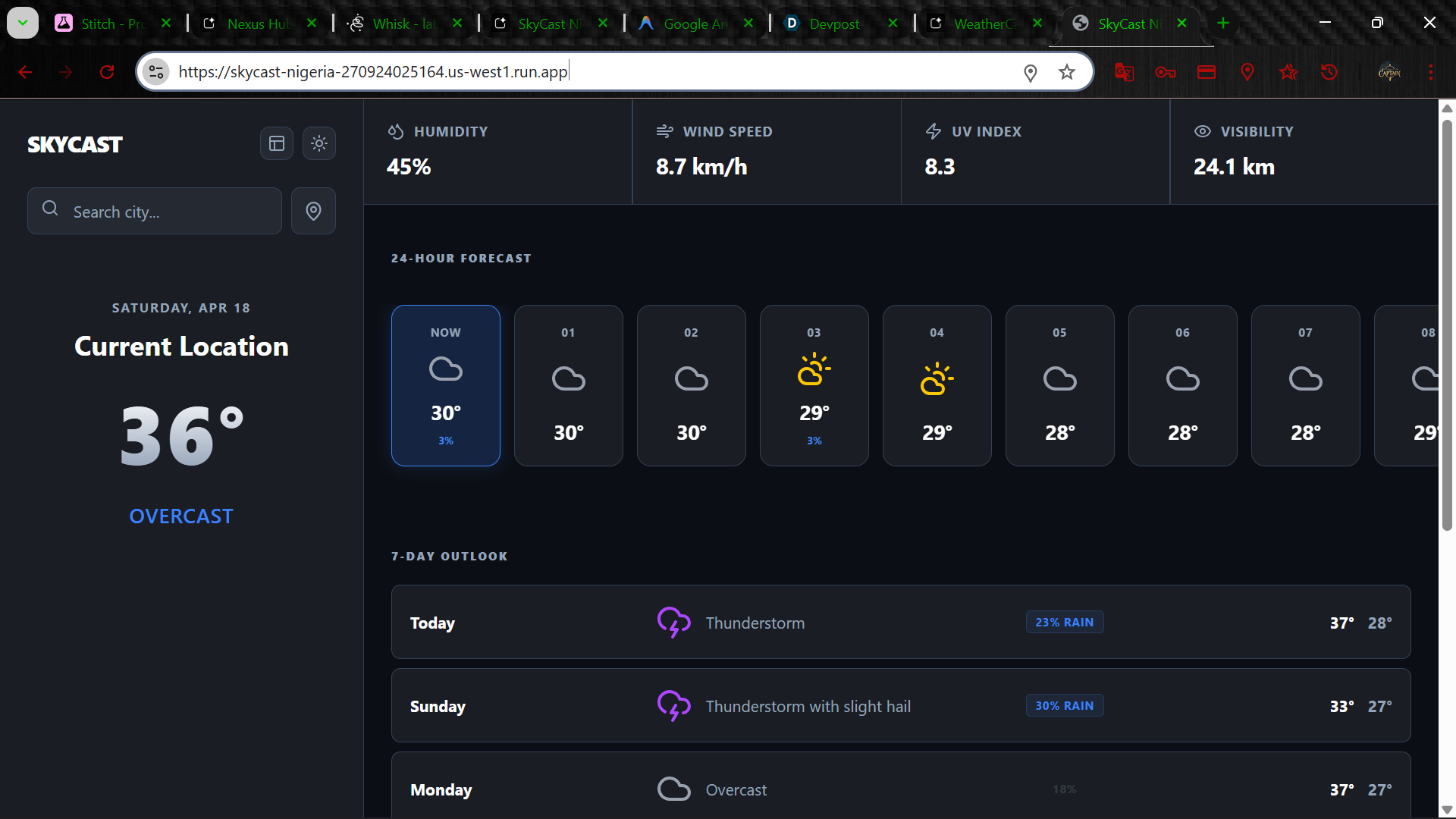 SKYCAST is a simple and fast weather forecasting website built for users in Nigeria, especially in cities like Lagos, Abuja, and Port Harcourt. The website provides current weather conditions, hourly forecast for the next 24 hours, and a 7-day daily forecast. It supports automatic location detection and manual city search. The design is mobile-friendly, lightweight, and works well even on slower internet connections. This project is developed using HTML, Tailwind CSS, and JavaScript, with weather data powered by the free Open-Meteo API. No AI features or backend server are used, making it easy to build, maintain, and host for free. The main goal is to deliver accurate and reliable weather information in a clean, user-friendly interface.