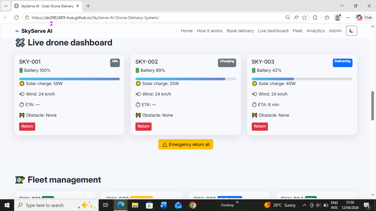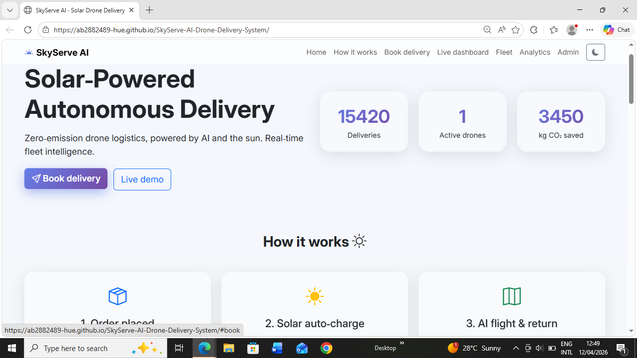 SkyServe AI is a fully responsive web-based simulation of an autonomous solar-powered drone delivery system.