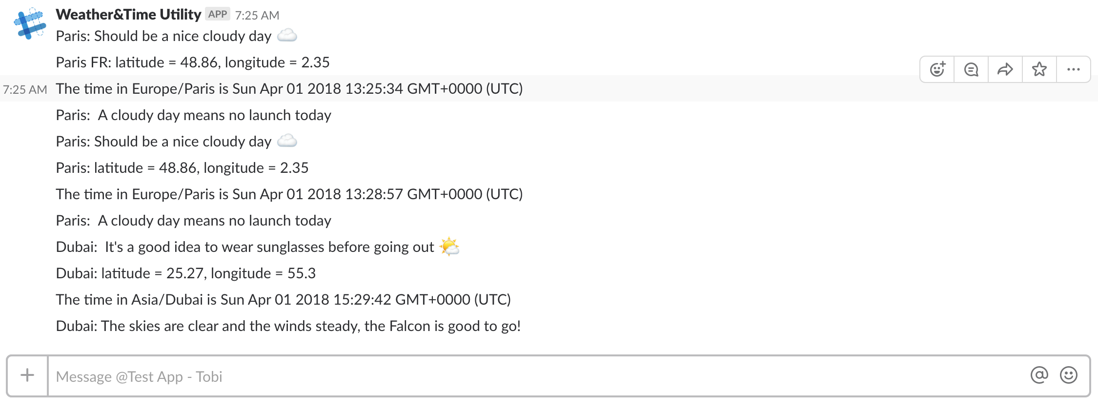 Uses the openweathermap api, maps.google api and stdlib's slackbot integration to determine the time and weather in other cities using a slackbot. Also has a pretty neat feature for people who love SpaceX and rockets in general.