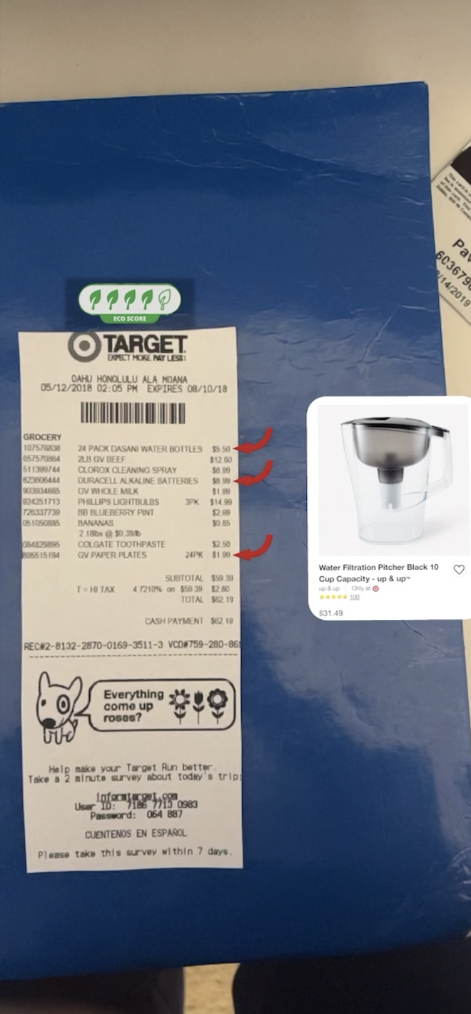 In the future, we want to be able to provide users with sustainable alternatives while they’re shopping instead of only in the credit card statement; preferably through an AR integrated shopping list, or an inventory system that tells them what they have at home, what they need to buy, and where they can buy it so that they can go local and go green.