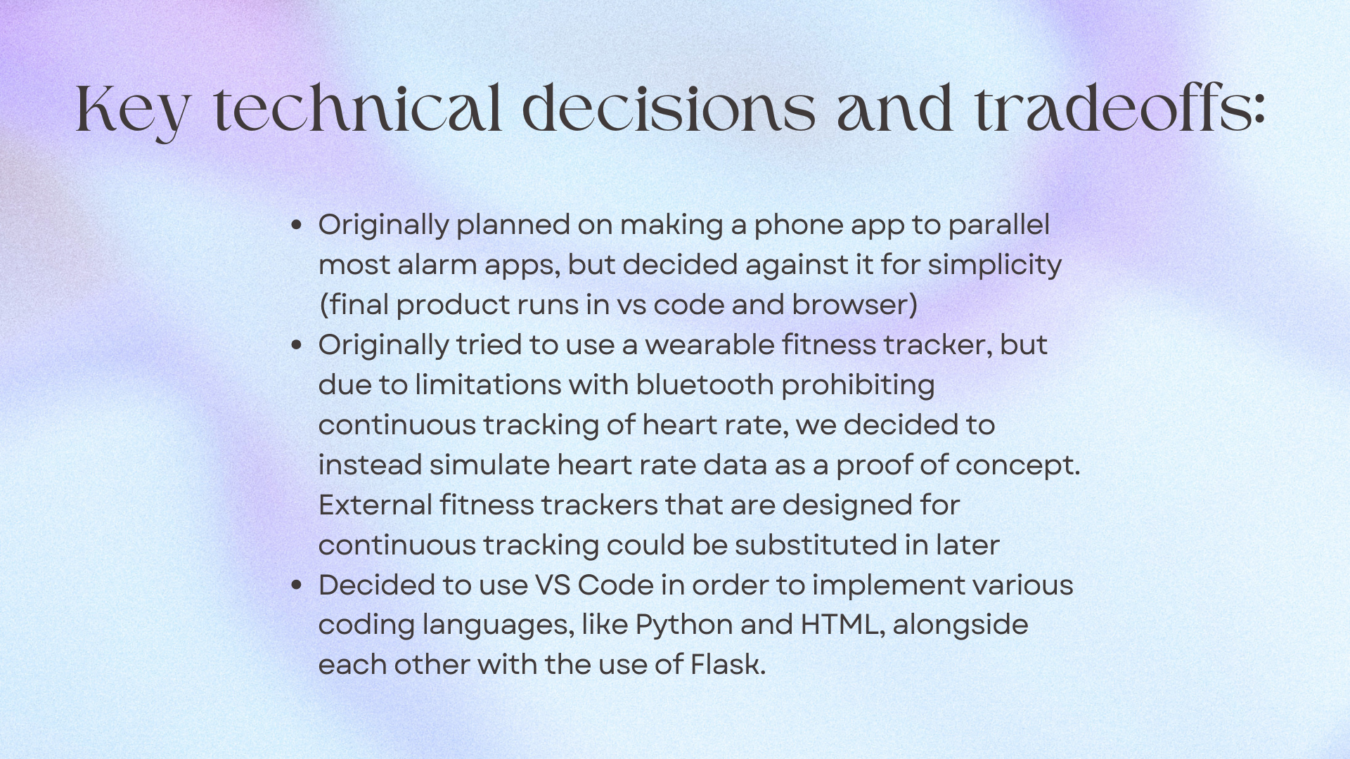 The project will take input from the user for the wake window in which they will like to wake up. Analyzing their heart rate (using a fitbit or other heartrate tracking system) and calculating heart rate variance, the alarm will classify the user's sleep stage as either 0,1,2,3, or 4. The program will sound the alarm to wake the user up when the sleep stage hits 1, or when the end of the wake window is reached.