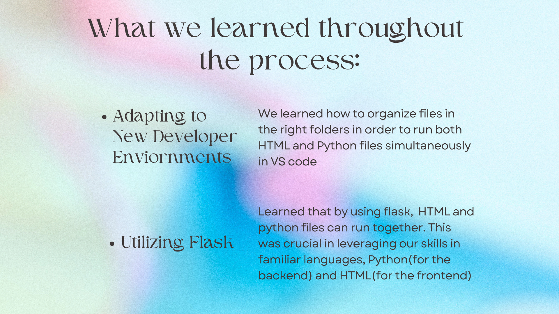 We learned how to organize files in the right folders in order to run both HTML and Python files simultaneously in VS code. We also learned that by using flask, HTML and python files can run together. This was crucial in leveraging our skills in familiar languages, Python(for the backend) and HTML(for the frontend)