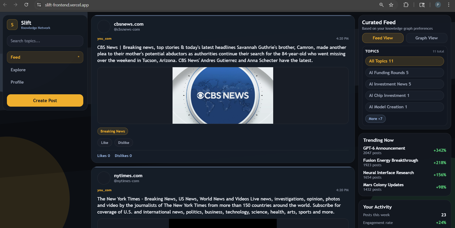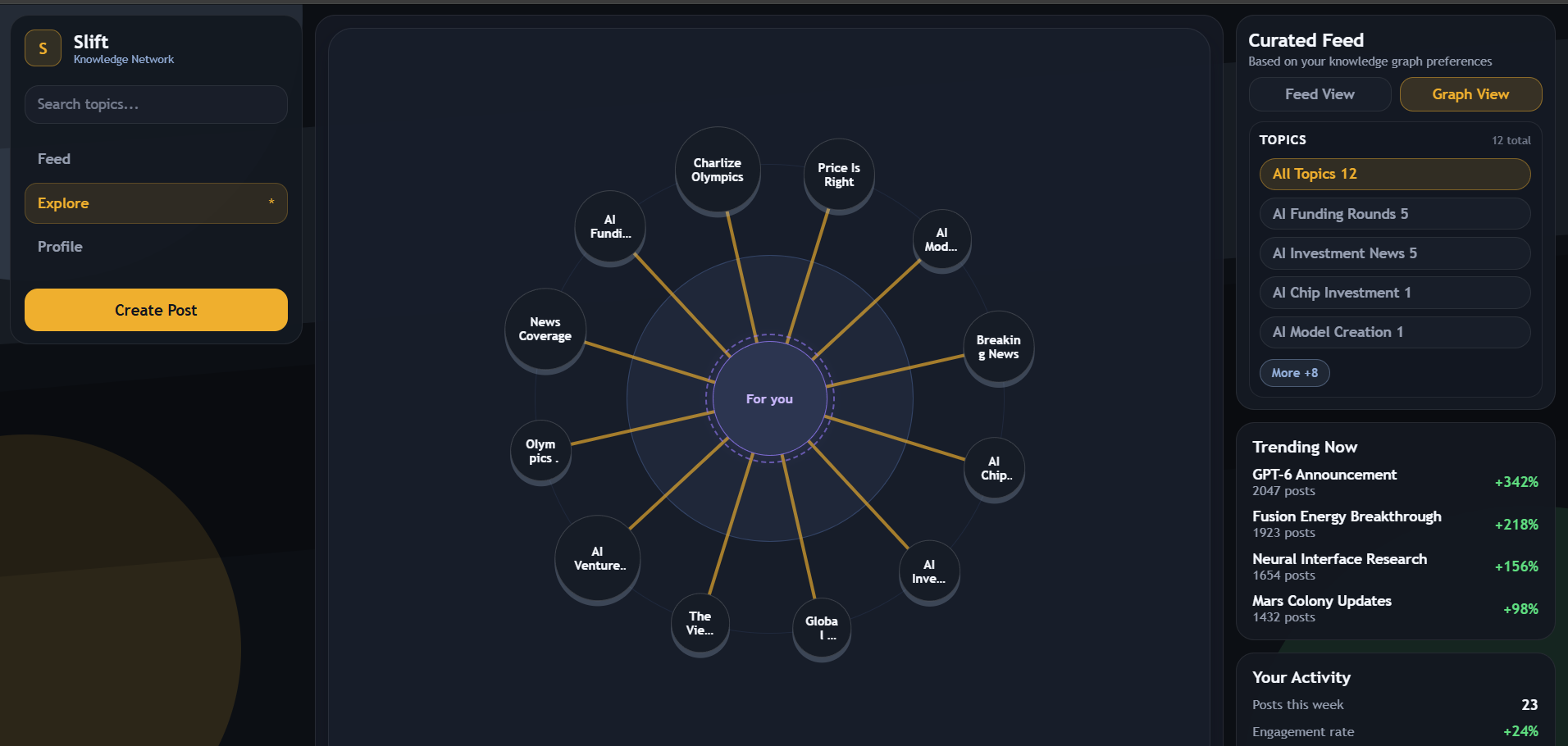 Slift is a knowledge-driven content discovery platform that transforms social media posts into a navigable knowledge graph.