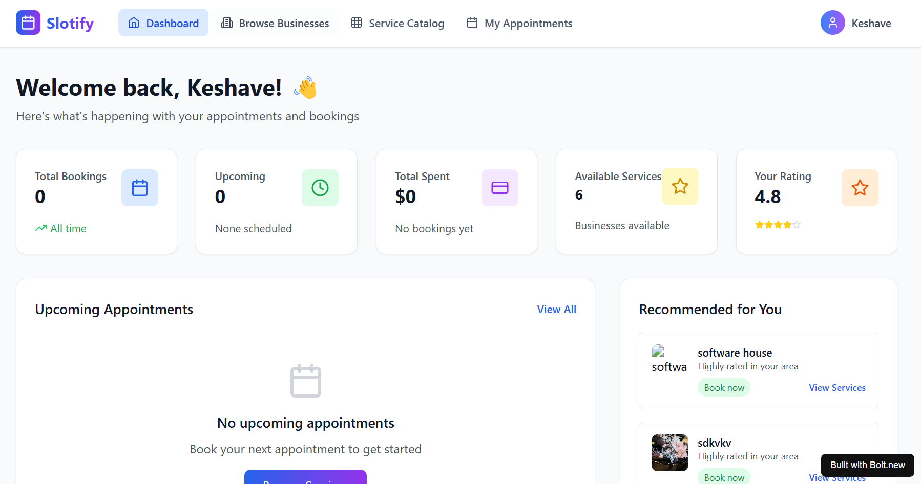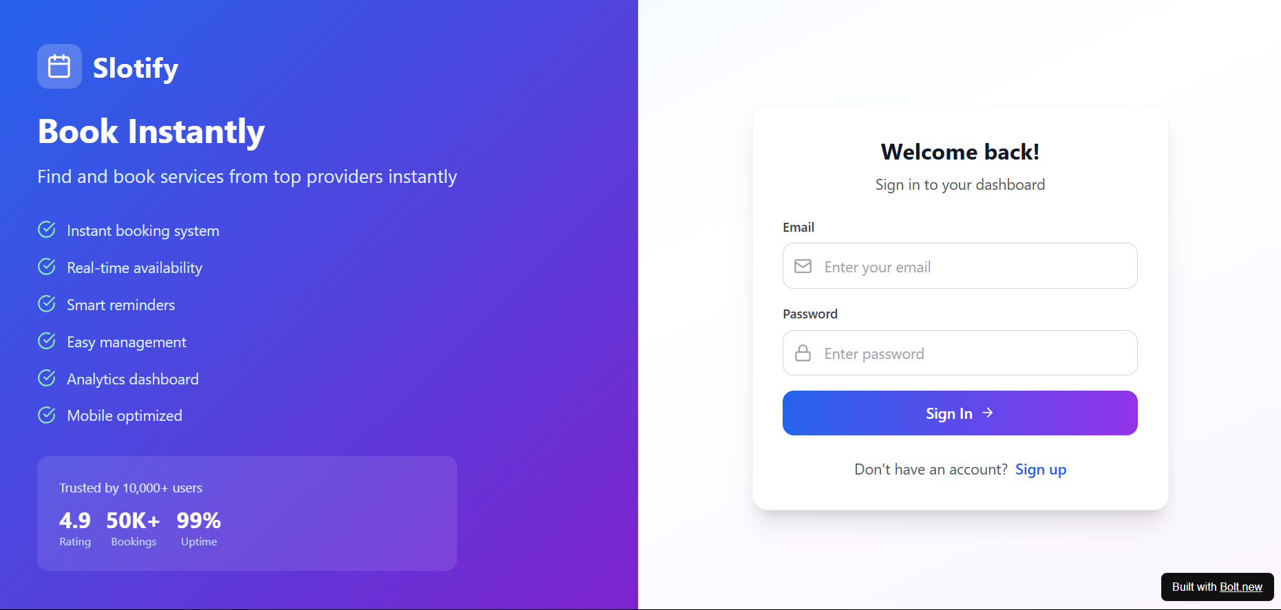 The idea for Slotify was born out of everyday frustration — missed calls, confusing texts, and clunky booking systems that waste time for both users and businesses. Whether it’s a salon, clinic, or coaching center, scheduling appointments should be simple, smooth, and stress-free. Slotify aims to fix this with a dynamic, real-time solution for both sides.