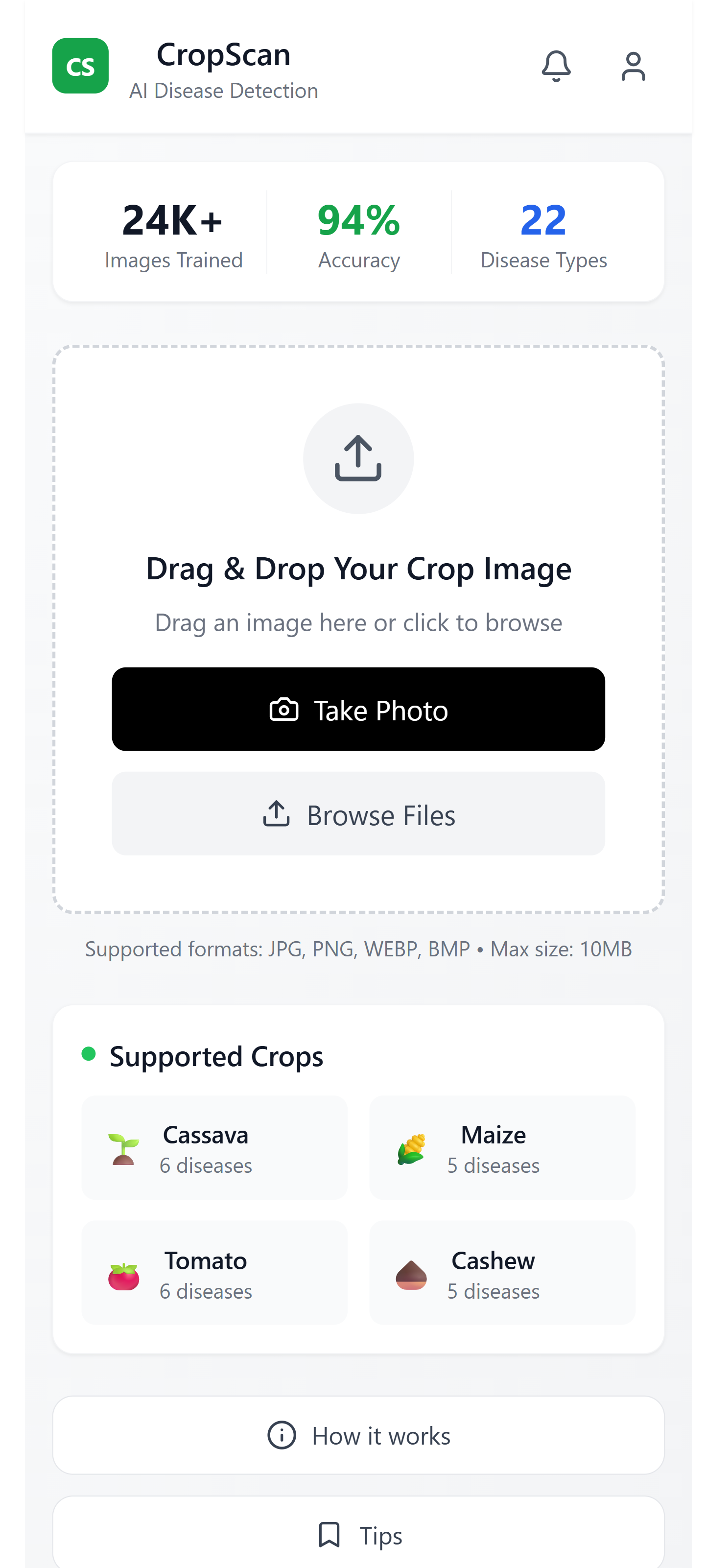 CropScan is an intelligent agricultural solution that uses deep learning to identify crop diseases from leaf images. Farmers and agricultural professionals can simply upload a photo of an affected crop leaf, and our AI model provides instant diagnosis along with detailed treatment and prevention recommendations.
