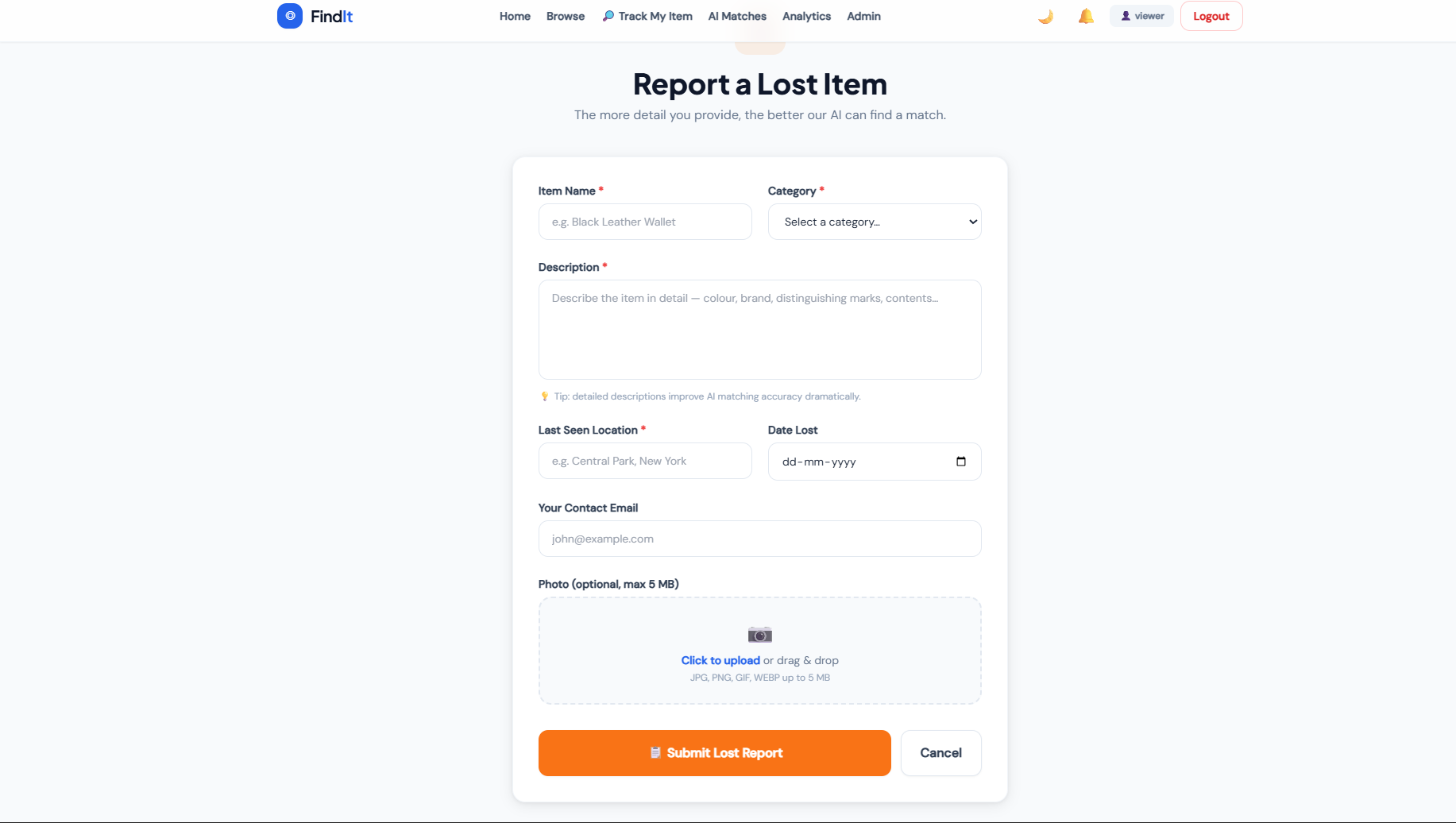 Report Lost Item Form – users can submit lost items with description and location.