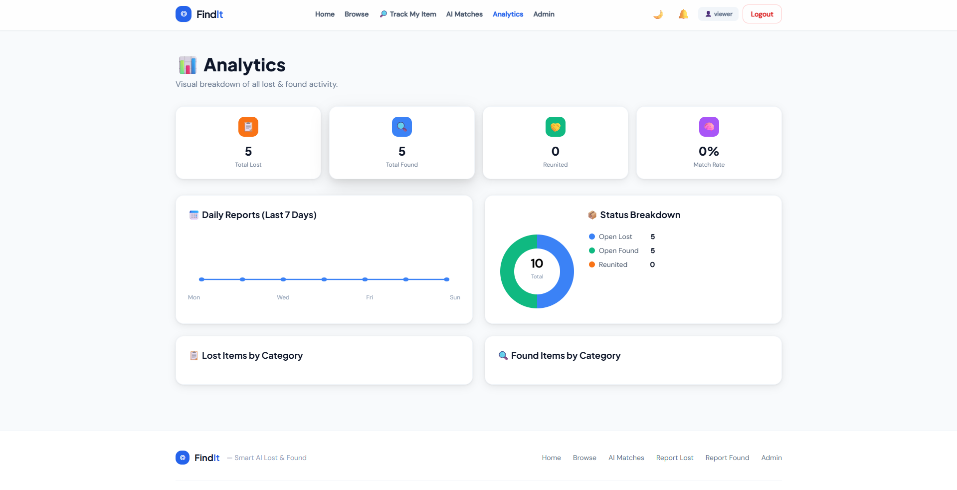Admin Dashboard – view statistics, manage reports and reunite items.