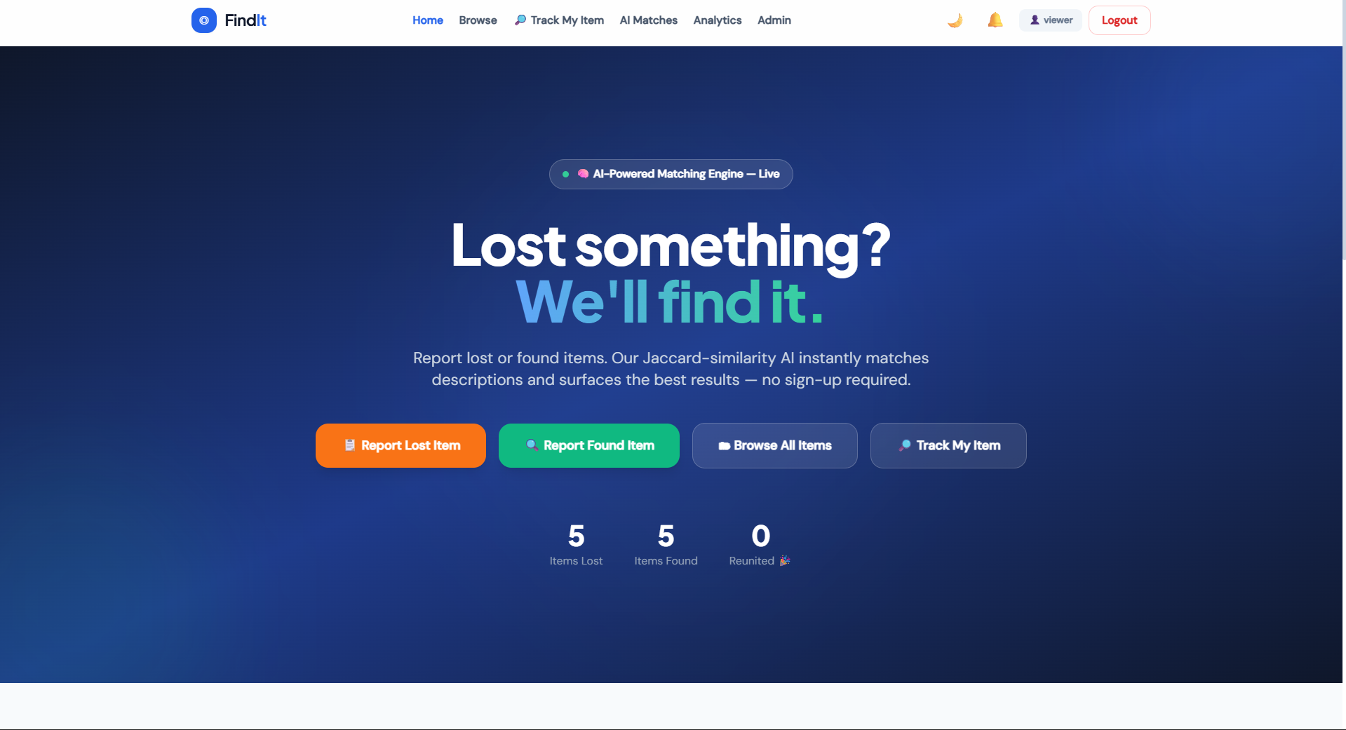 AI Matching Engine – compares lost and found items using Jaccard similarity.