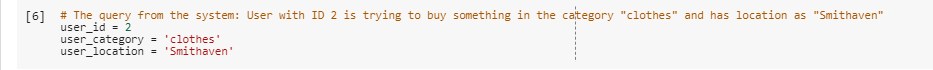 Simulating an E-commerce setup: The program starts by reading three sets of data : the users table, the orders table and the products table. The user is asked for query like "Help me find some new clothes" The algorithm takes the query from user on what product category they are looking for eg. clothes, laptops, phones etc. The past history of products bought by this user are examined. The algorithm tries to find other users that have bought similar products as this user. The algorithm then tries to find all the products in the asked category that were bought by these matched users. Filtering is applied on the location of the products from previous step to check if they are available in original user's location. Finally the algorithm returns the products in the order that were most bought in the users area.